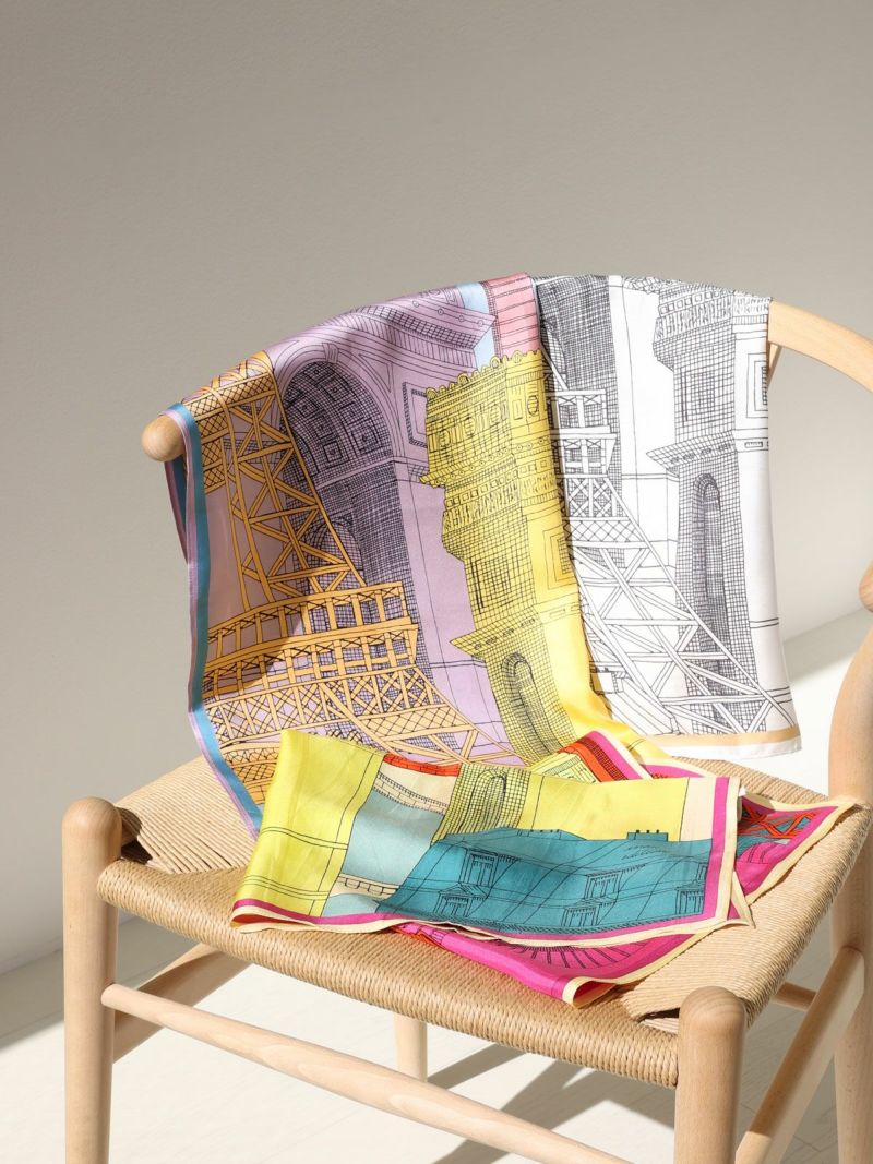 フランスの街並みがアイコニックに描かれた一枚。シンプルになじみやすいベージュ、柔らかいパステル調のパープル、アクセントになるマルチカラーとそれぞれ違う印象のカラー展開。シルク100%でシワになりにくく、鞄に巻いたり肩にかけたり様々な用途でお使いいただけます。