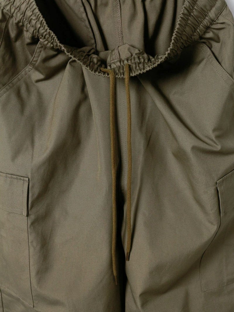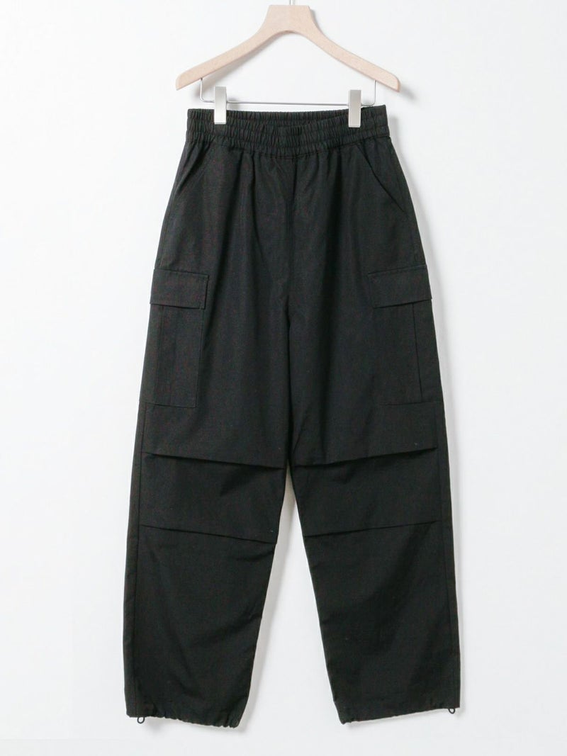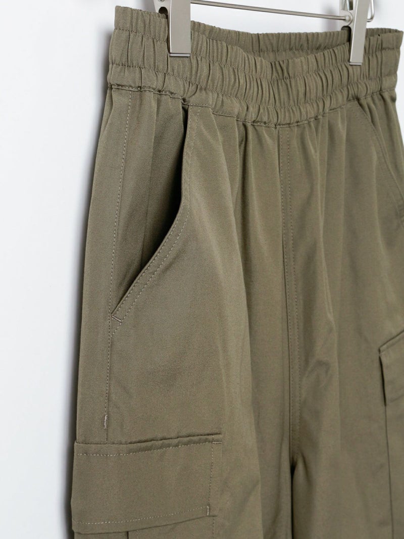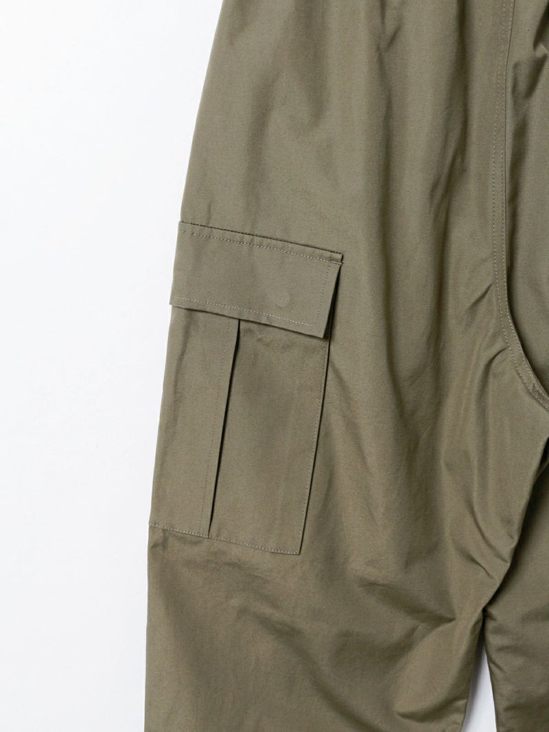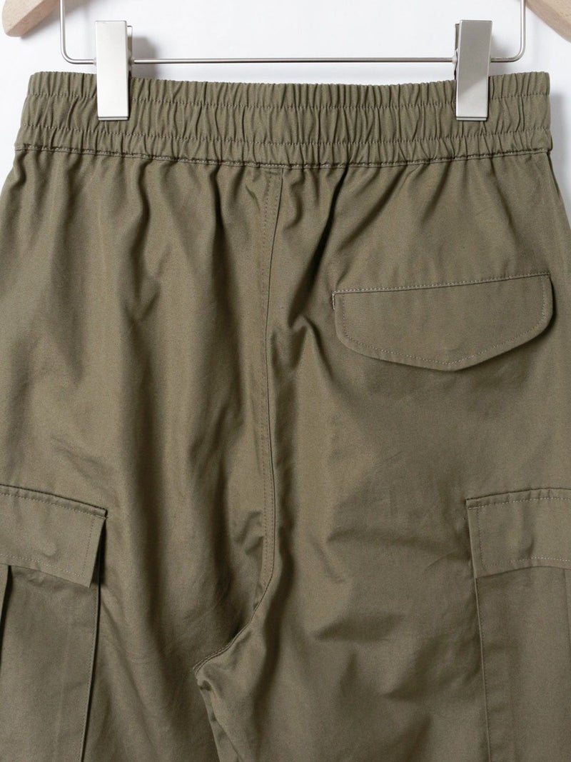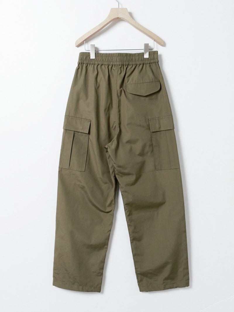 M65をベースに、カジュアルでリラックス出来るようイージー仕様に落とし込みデザインされたカーゴパンツ。綺麗なトップスに対してのハズしのパンツになってくれたら嬉しいアイテムです。裾はドローコードで絞ることも可能なため、敢えて長めの着丈に設定。ウエストは平ゴム+紐で調整可。ポケットに手が入れやすいよう腰もとのポケットはフラップ無しに。※キナリのみ裏地付き