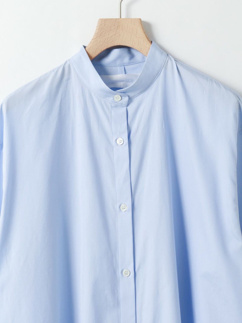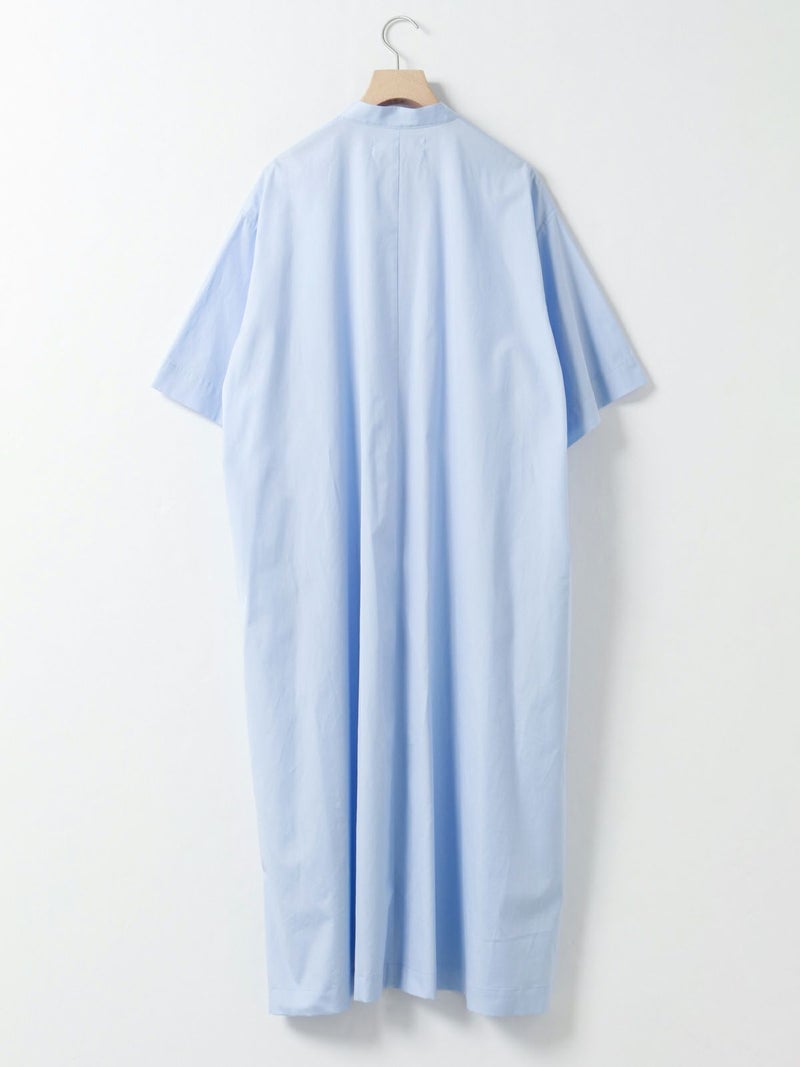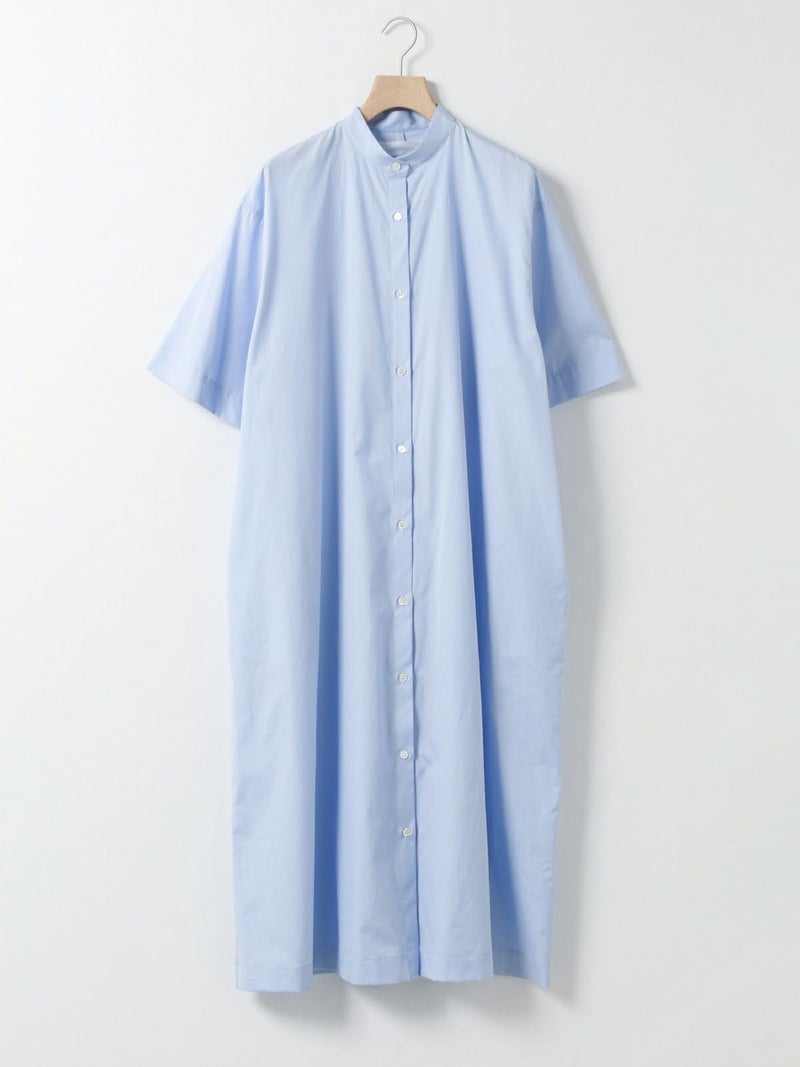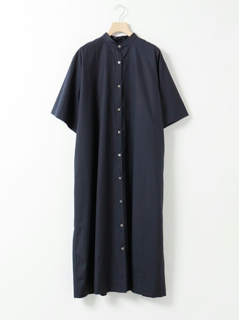 ワイドなサイズ感でリラックス感がありながらも縦ラインを強調するストレートシルエットとマキシ丈に拘った、すっきり見えするスタンドカラーワンピースです。ディテールはシンプルに仕上げ、シルエットをポイントに。ポケット付。ケバ感を抑えたクリアな表面感とナチュラルな光沢感のある上品な綿100%の100/2ブロードを使用したシンプルな1枚です。
