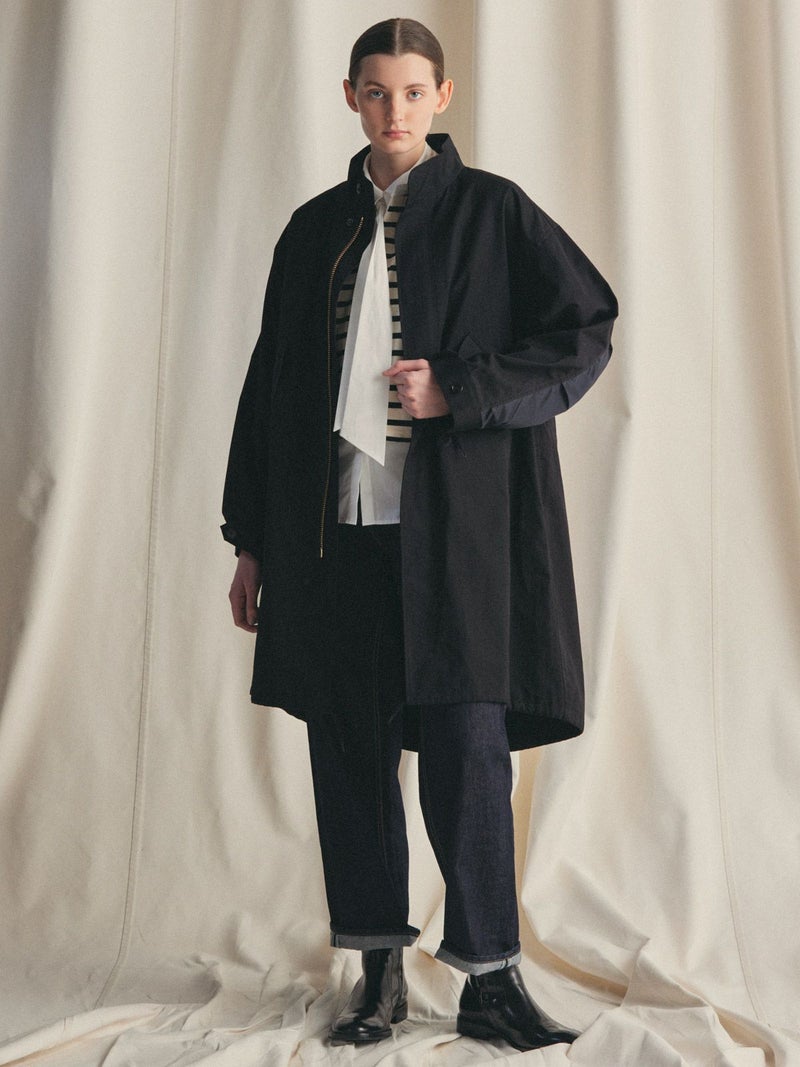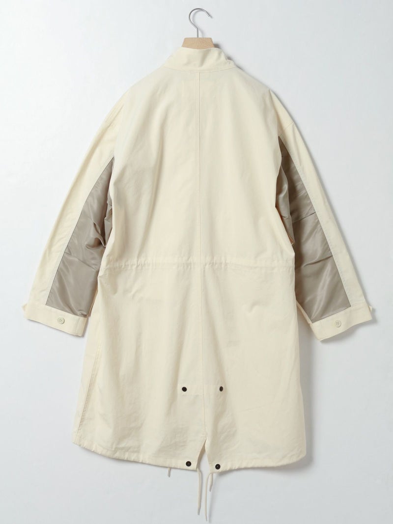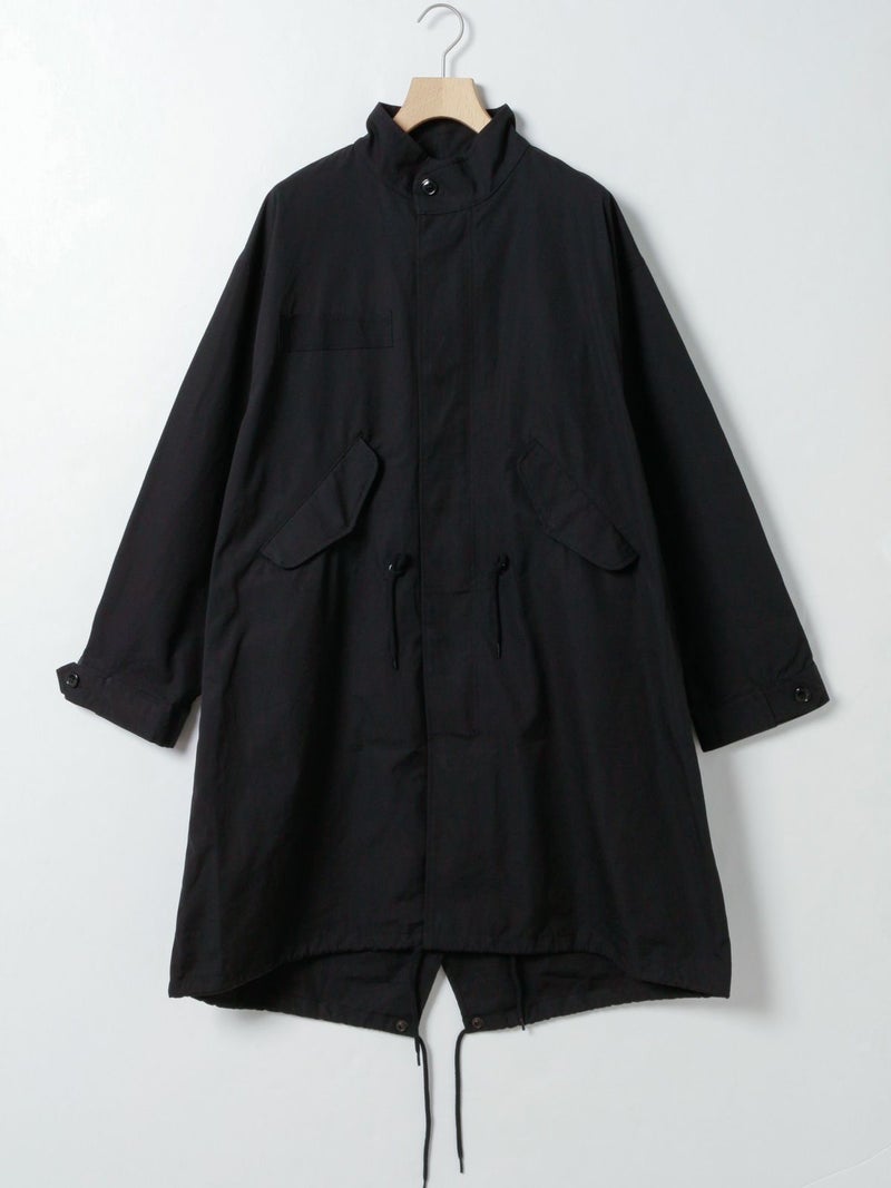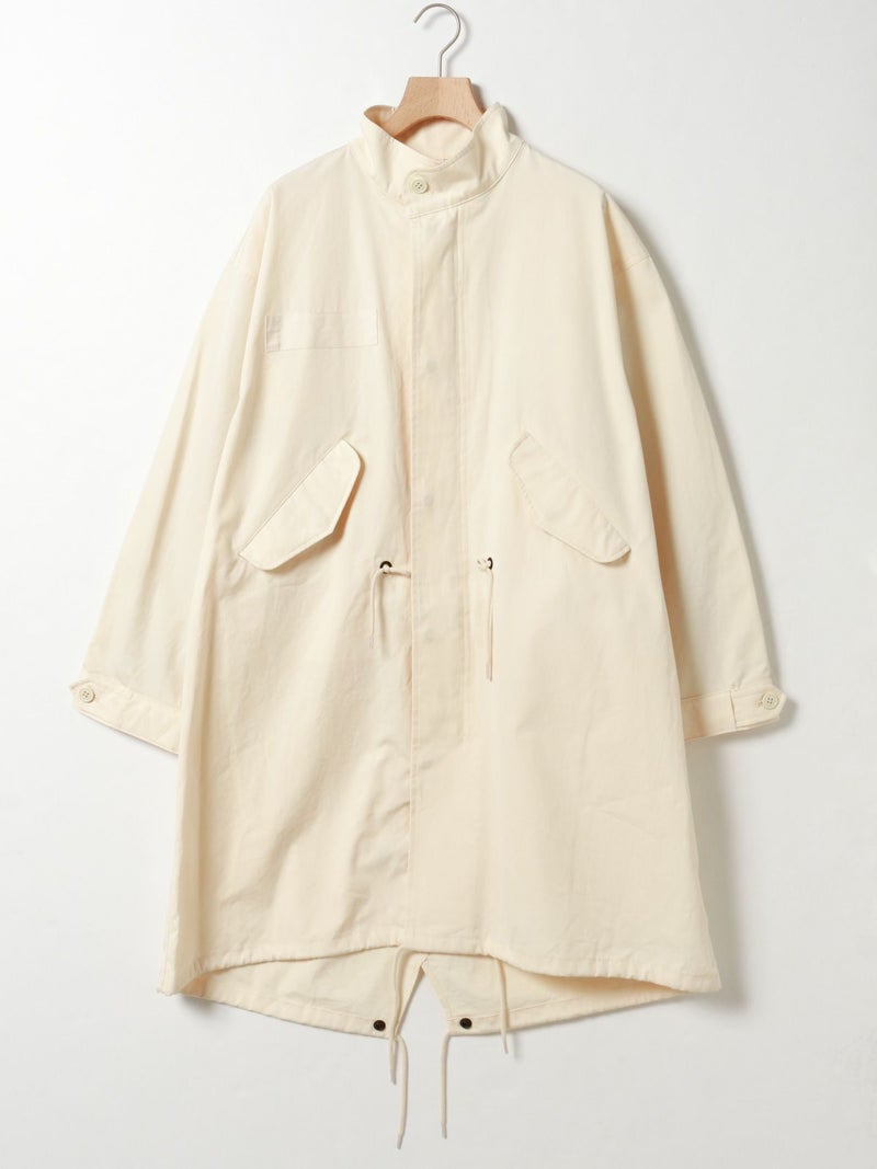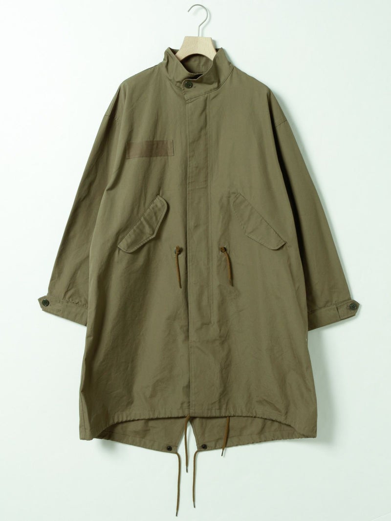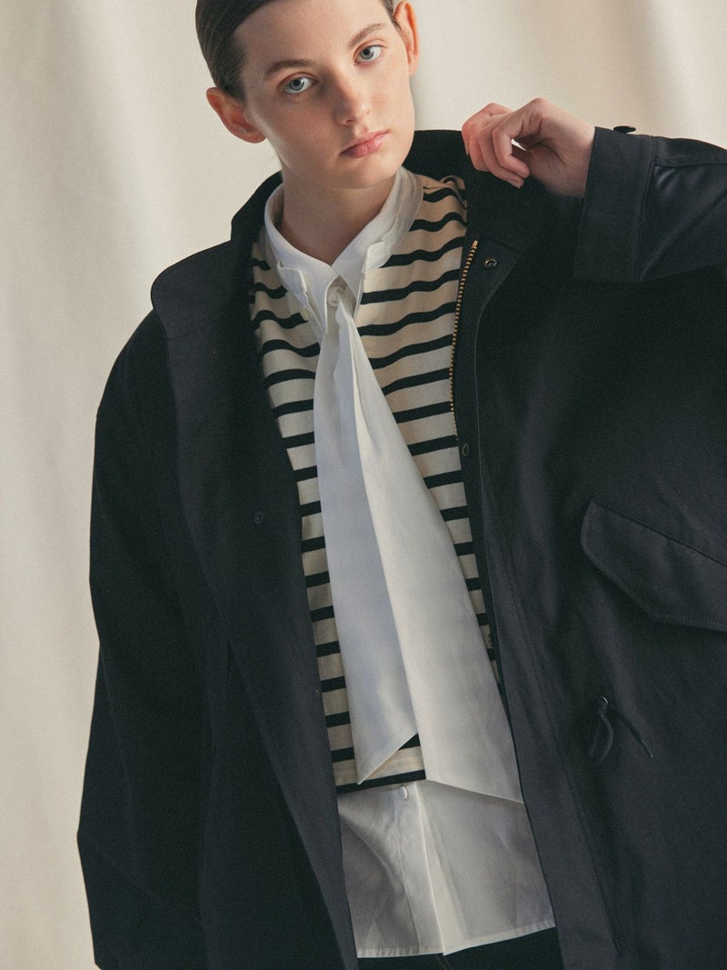 M65をベースに、ディティールを削ぎ落してデザインされたフィッシュテールコート。(実際のM65:Sサイズを元に女性が大きめに着るイメージのサイズ感・シルエット)。フロントのファスナーやテープなどの付属類はメンズライクなもの使用。軍物特有の荒い縫製からくるパッカリングをある程度再現し、立体感、存在感のあるアイテムに。袖下のパーツをMA1などに使われるナイロン生地に切り替え、リメイク感を出すことで着こなしに程よい抜け感をプラスすることで女性らしく仕上がった1枚。