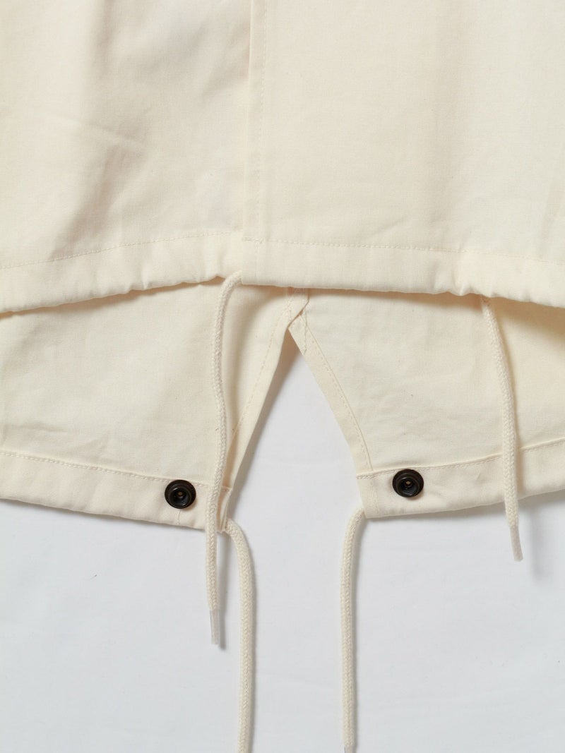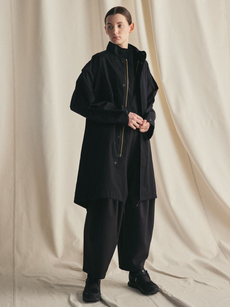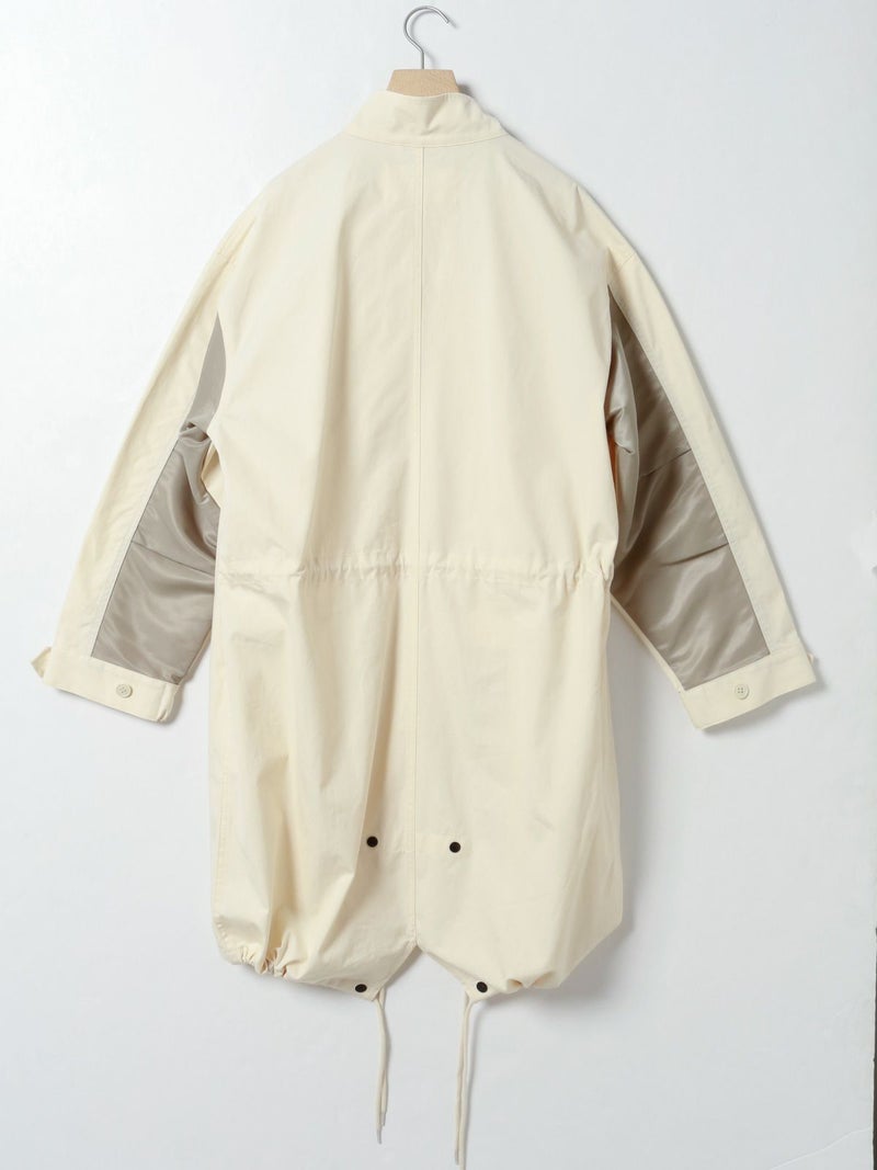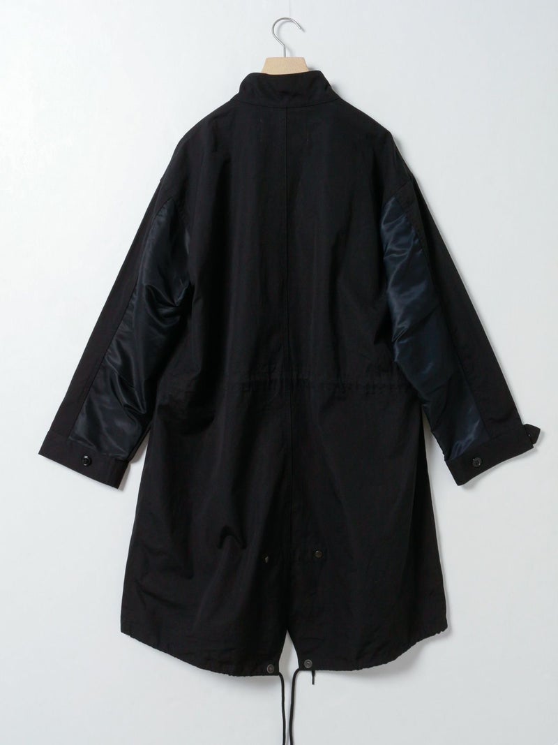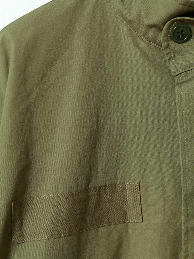 M65をベースに、ディティールを削ぎ落してデザインされたフィッシュテールコート。(実際のM65:Sサイズを元に女性が大きめに着るイメージのサイズ感・シルエット)。フロントのファスナーやテープなどの付属類はメンズライクなもの使用。軍物特有の荒い縫製からくるパッカリングをある程度再現し、立体感、存在感のあるアイテムに。袖下のパーツをMA1などに使われるナイロン生地に切り替え、リメイク感を出すことで着こなしに程よい抜け感をプラスすることで女性らしく仕上がった1枚。