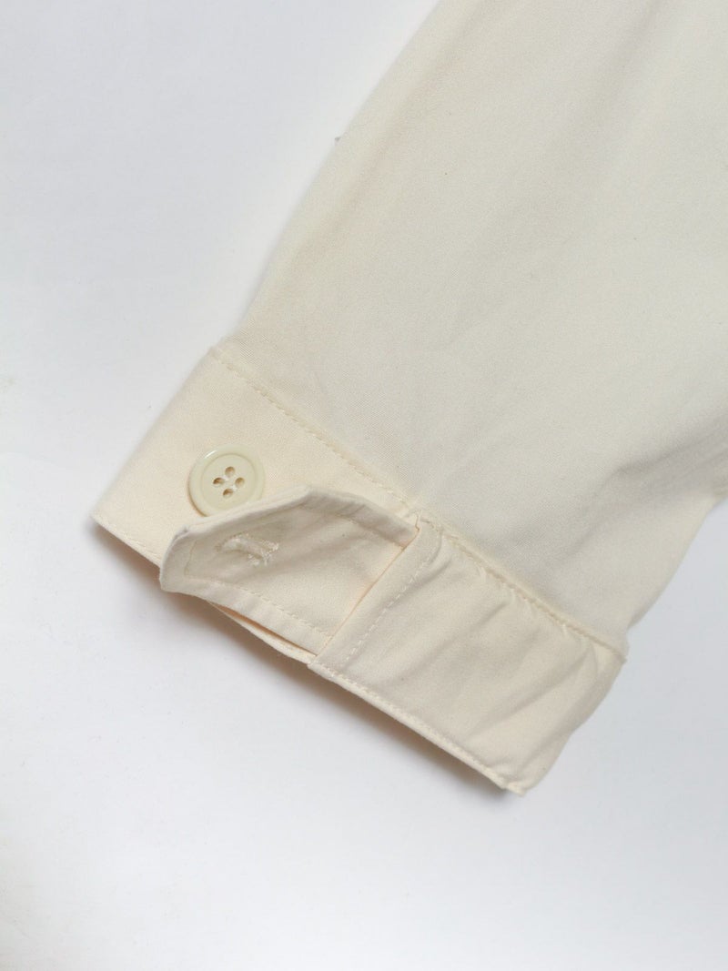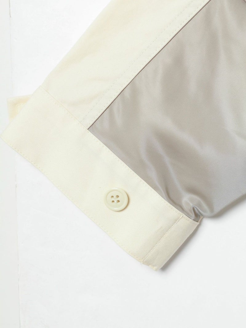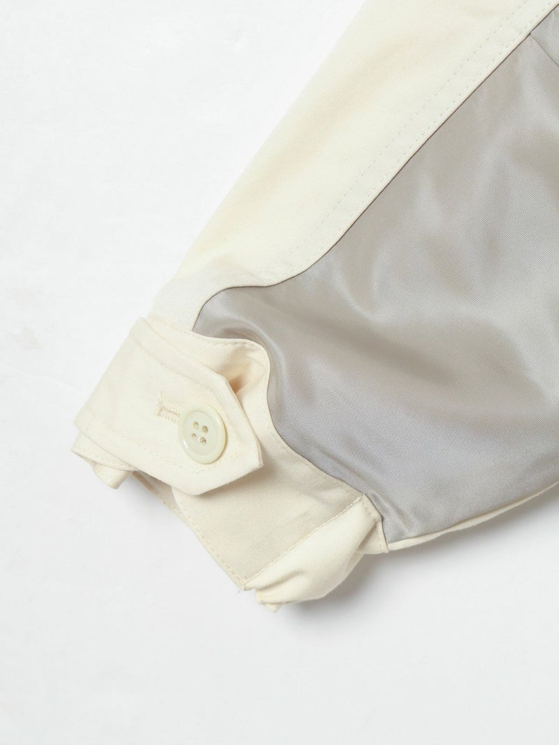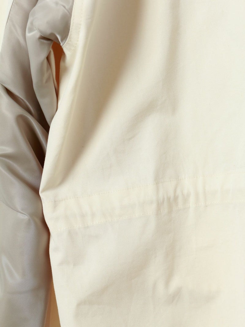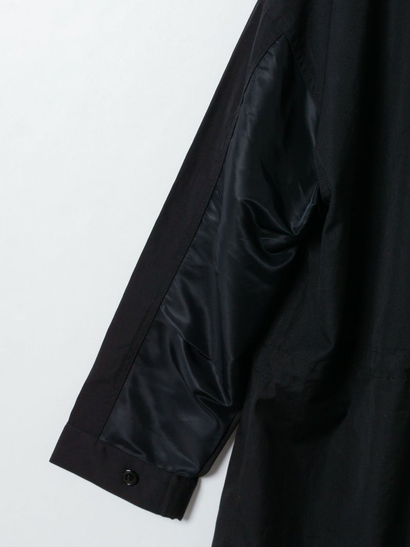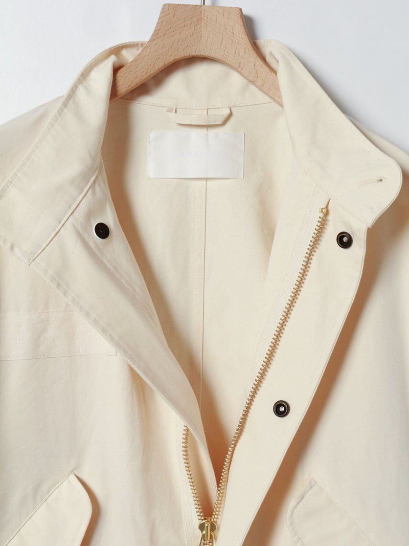 M65をベースに、ディティールを削ぎ落してデザインされたフィッシュテールコート。(実際のM65:Sサイズを元に女性が大きめに着るイメージのサイズ感・シルエット)。フロントのファスナーやテープなどの付属類はメンズライクなもの使用。軍物特有の荒い縫製からくるパッカリングをある程度再現し、立体感、存在感のあるアイテムに。袖下のパーツをMA1などに使われるナイロン生地に切り替え、リメイク感を出すことで着こなしに程よい抜け感をプラスすることで女性らしく仕上がった1枚。