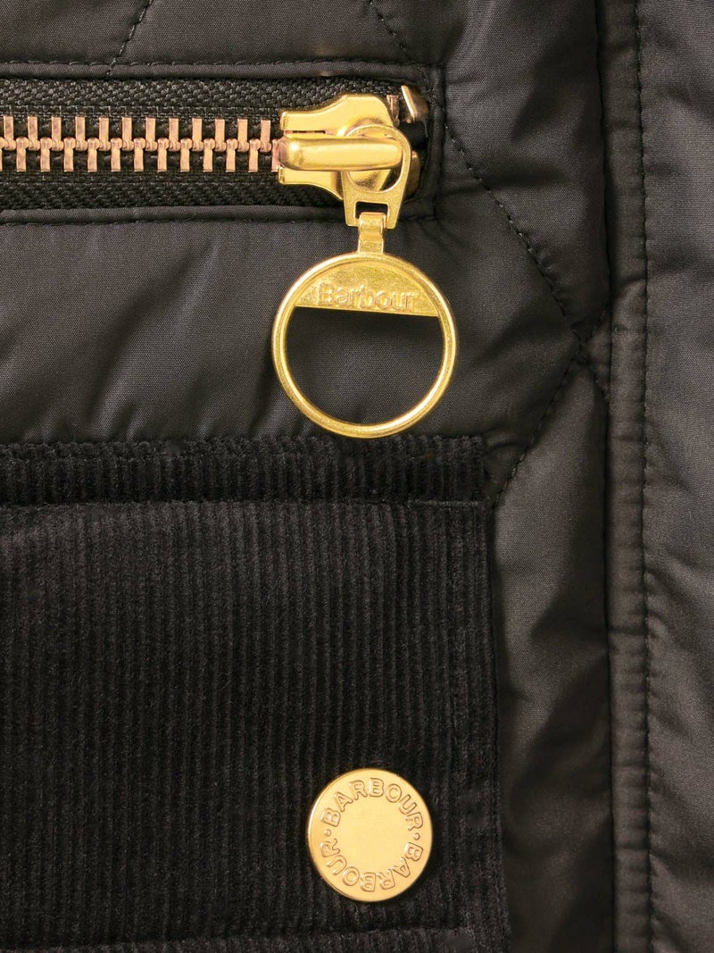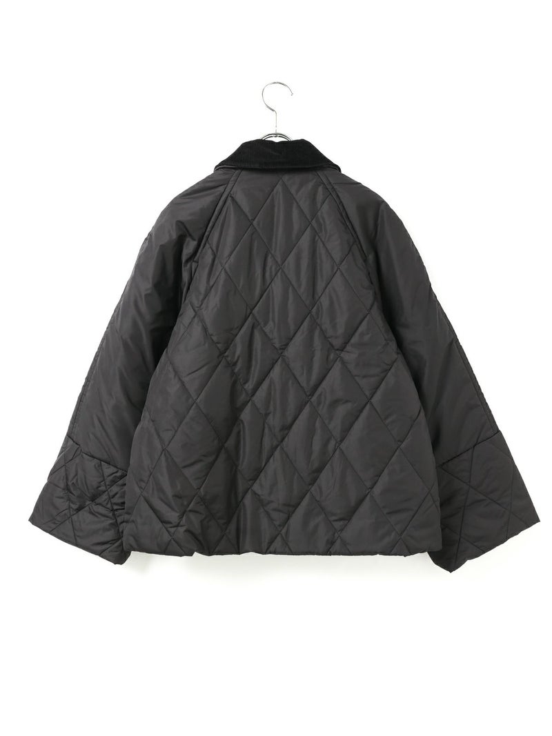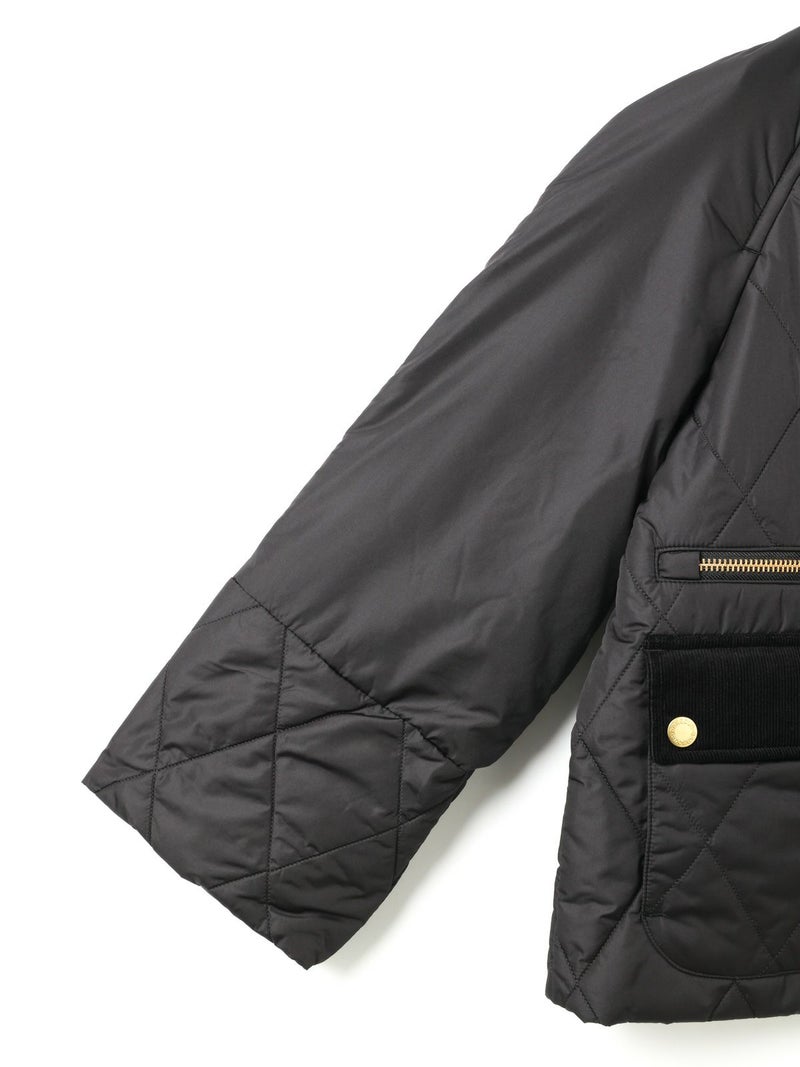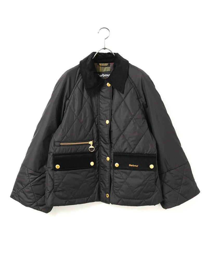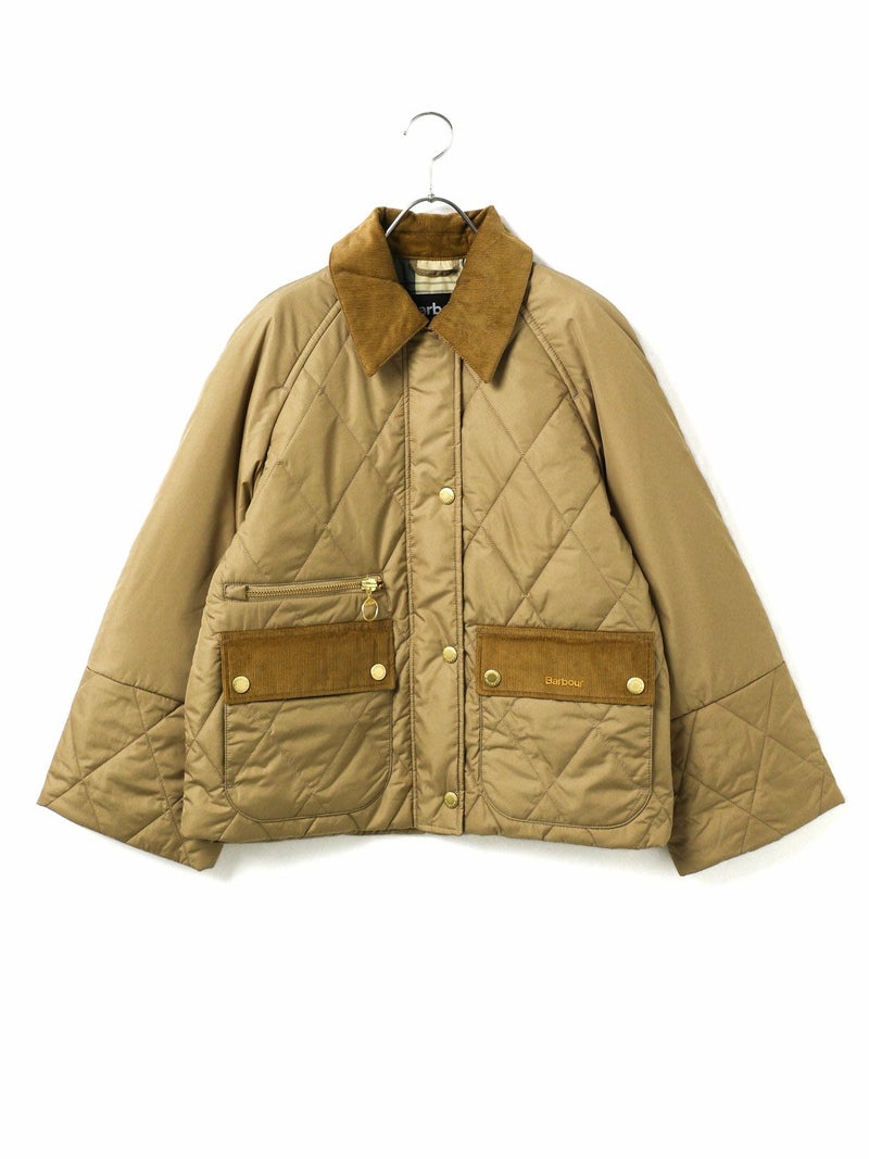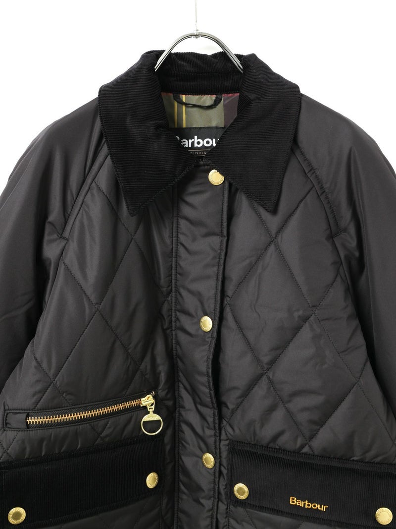 Barbour(バブアー)のキルティングジャケット。軽量で暖かいダイヤキルトに、ブランドらしいコーデュロイ襟やフラップポケットを組み合わせたクラシックなデザインが魅力です。ゴールドのスナップボタンやジップのアクセントが上品さを添え、インナーのチェック柄ライニングがさりげないおしゃれポイントに。羽織るだけでスタイリングを引き締めてくれる一着です。