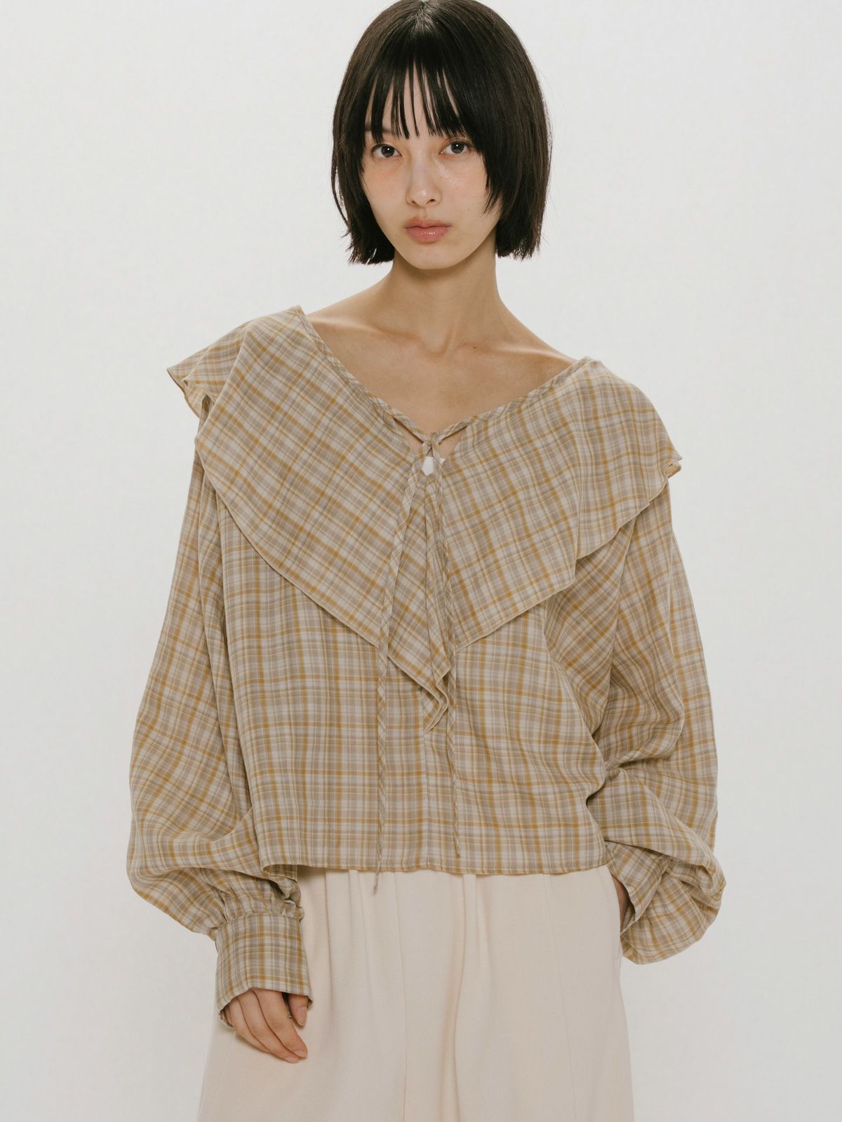 他の画像を見る お気に入りに登録する midiumisolid MIDIUMISOLID for Ladies チェックビッグフリルカラーブラウス price ¥ 18,480 税込 sold out COMING SOON