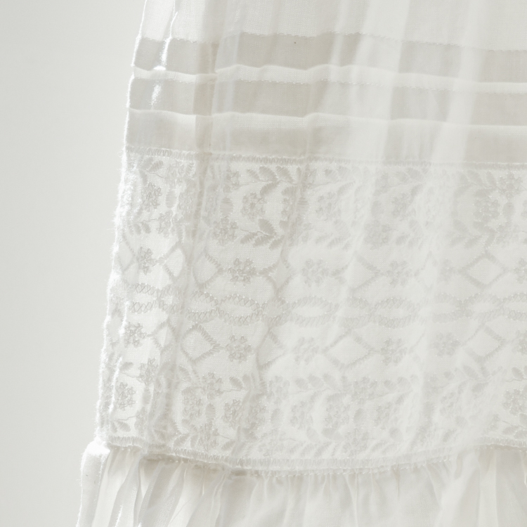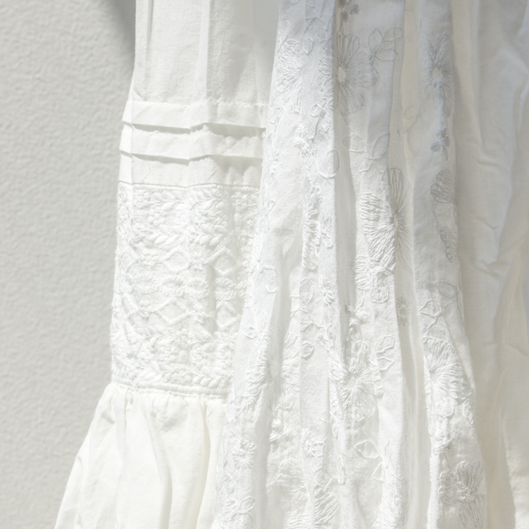 繊細な小花柄のレースを使用し、甘くなりすぎないようさりげないデザインに仕上げたことで、大人の女性にも取り入れていただきやすい1枚に。すとんと落ちるマキシ丈で縦のラインを強調したシルエットが、すっきりとした大人っぽさを演出。歩くたびに揺れるレースの表情が、さりげなく女性らしさを引き立ててくれます。