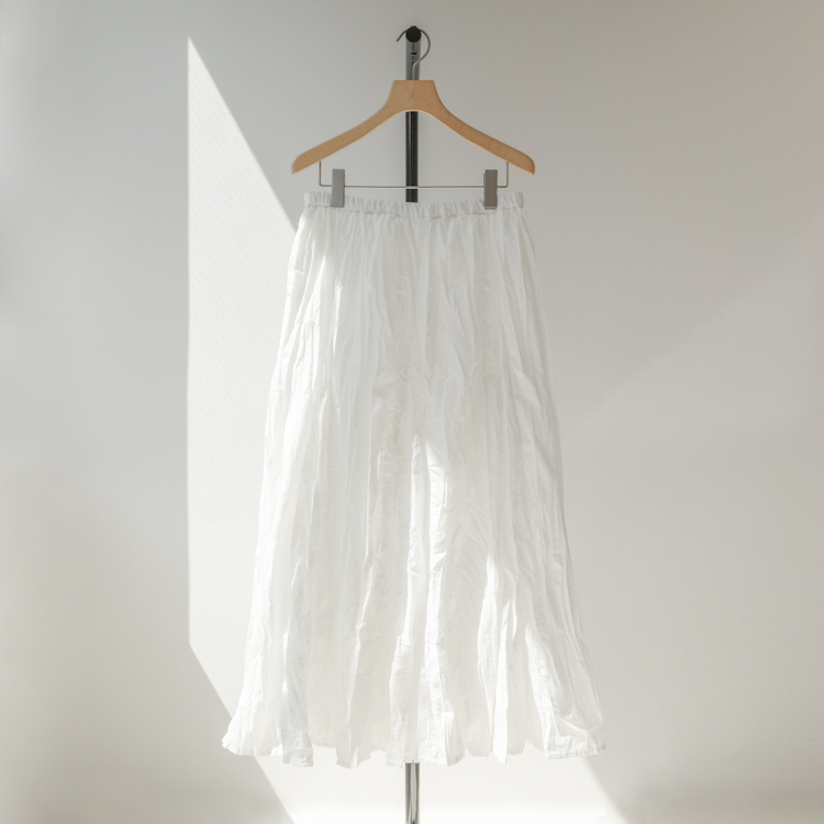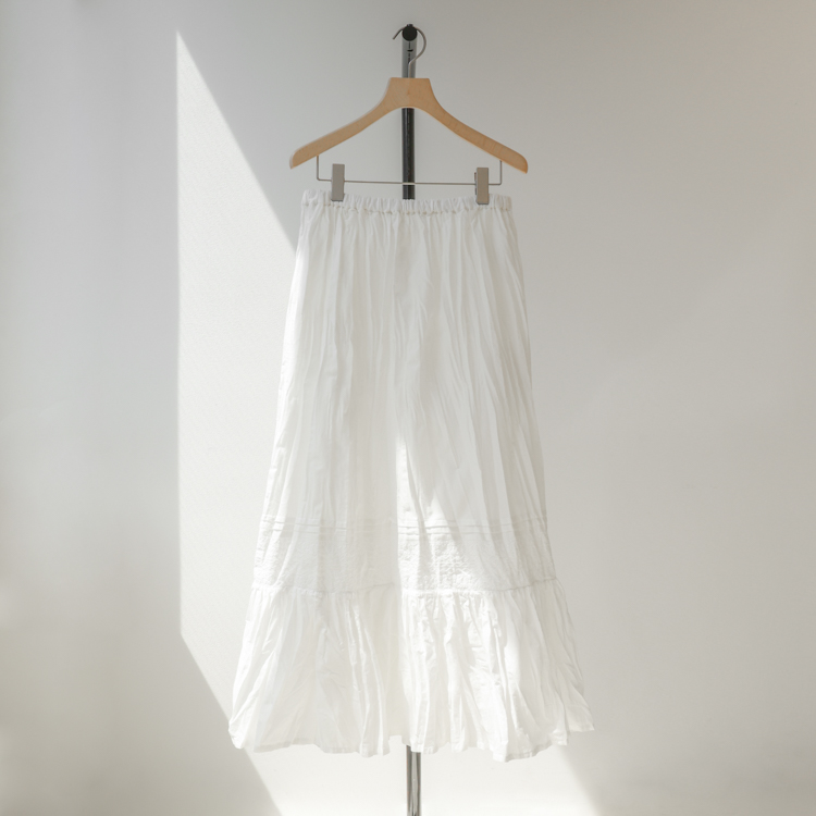 ヴィンテージショップで見つけたような、どこか懐かしくて温かみを感じさせる、繊細なレース使いが魅力のタックボリュームスカート。レースと無地を切り替えた表情豊かなディテールに、ふんわりと広がるタック入りのボリューム感が歩くたびに柔らかな動きを生み出し、程よい華やかさを添えてくれる1枚です。