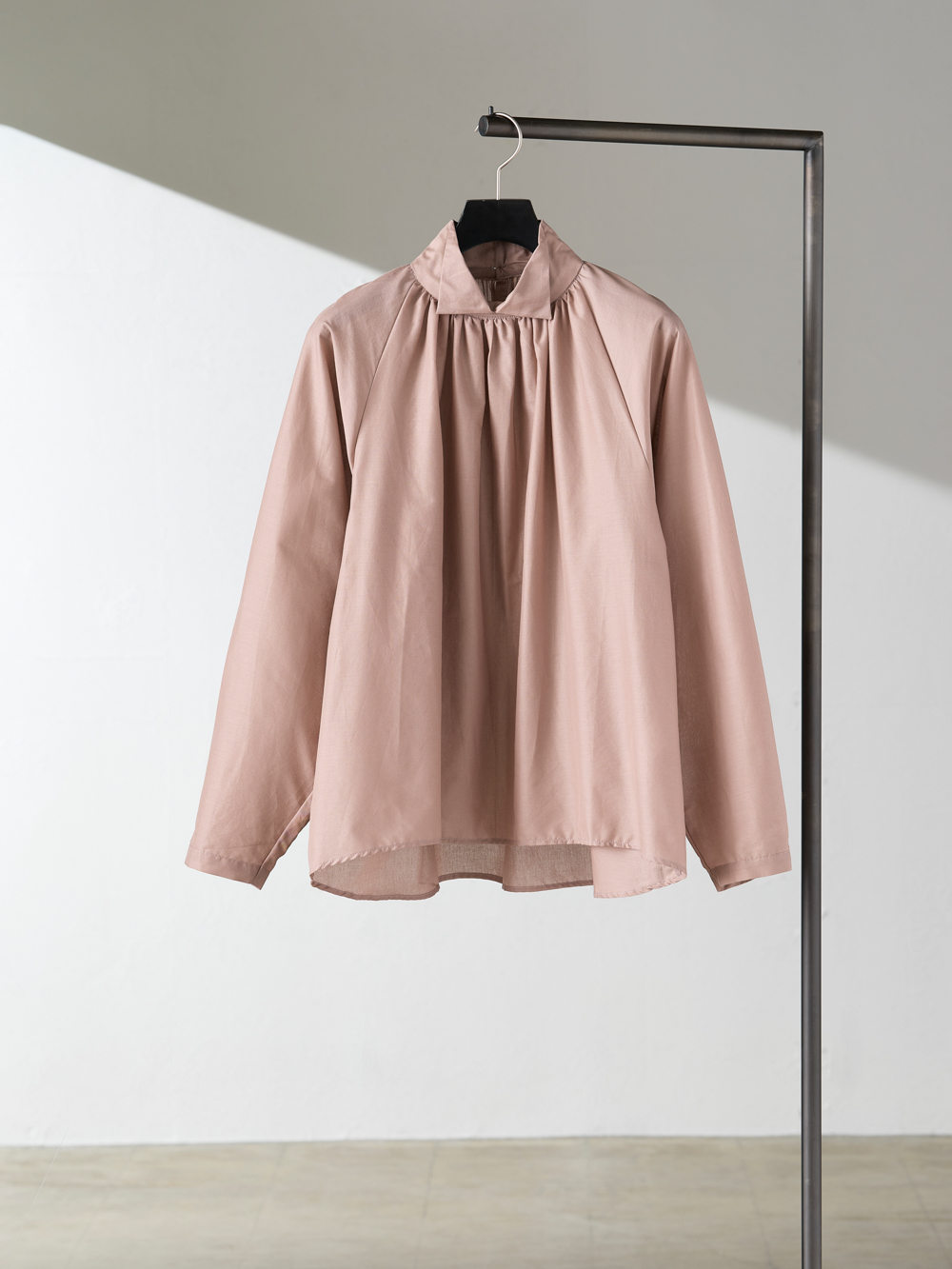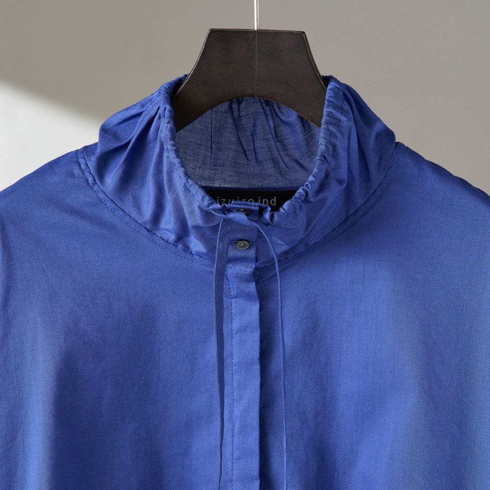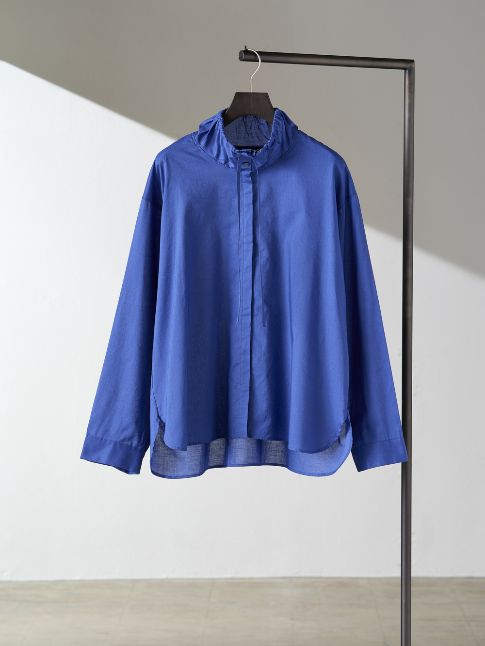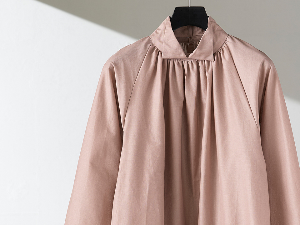 秋口に似合う薄手で軽やかなコットン素材を使用しています。スタンドカラー部分にギャザーをあしらい、襟元の紐を縛ったり広げたりできる可変性のあるデザインです。フロントボタンは比翼仕立てにしてすっきりと。前後差のある身頃など、ディテールのメリハリが効いています。