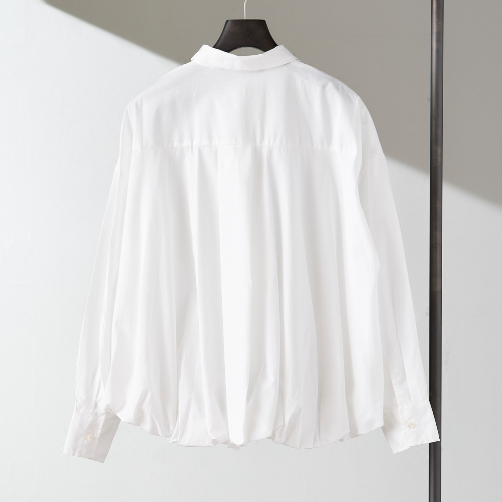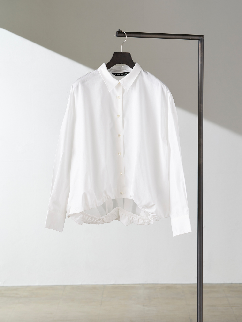 シャツの裾を内側に留め、ふわりとボリュームをつけたデザインです。前身頃や袖周りのサイズ感はすっきりとしていて一見プレーンカラーシャツのようですが、ゆとりのあるウエスト周りや、バックスタイルで立体感を出しています。控えめなバルーンシルエットがキレイめスタイルに好相性です。