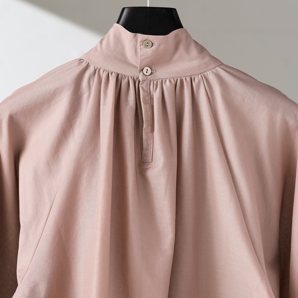 高さのあるスタンドカラーと、その襟元に細かくギャザーをよせて裾にかけてキレイな広がりを演出しています。着丈には前後差をつけてあり、バックスタイルはゆるやかにラウンドしている裾がこなれた印象に。透け感のある繊細なコットン素材を使用しているので、着こなしを上品にまとめてくれます。