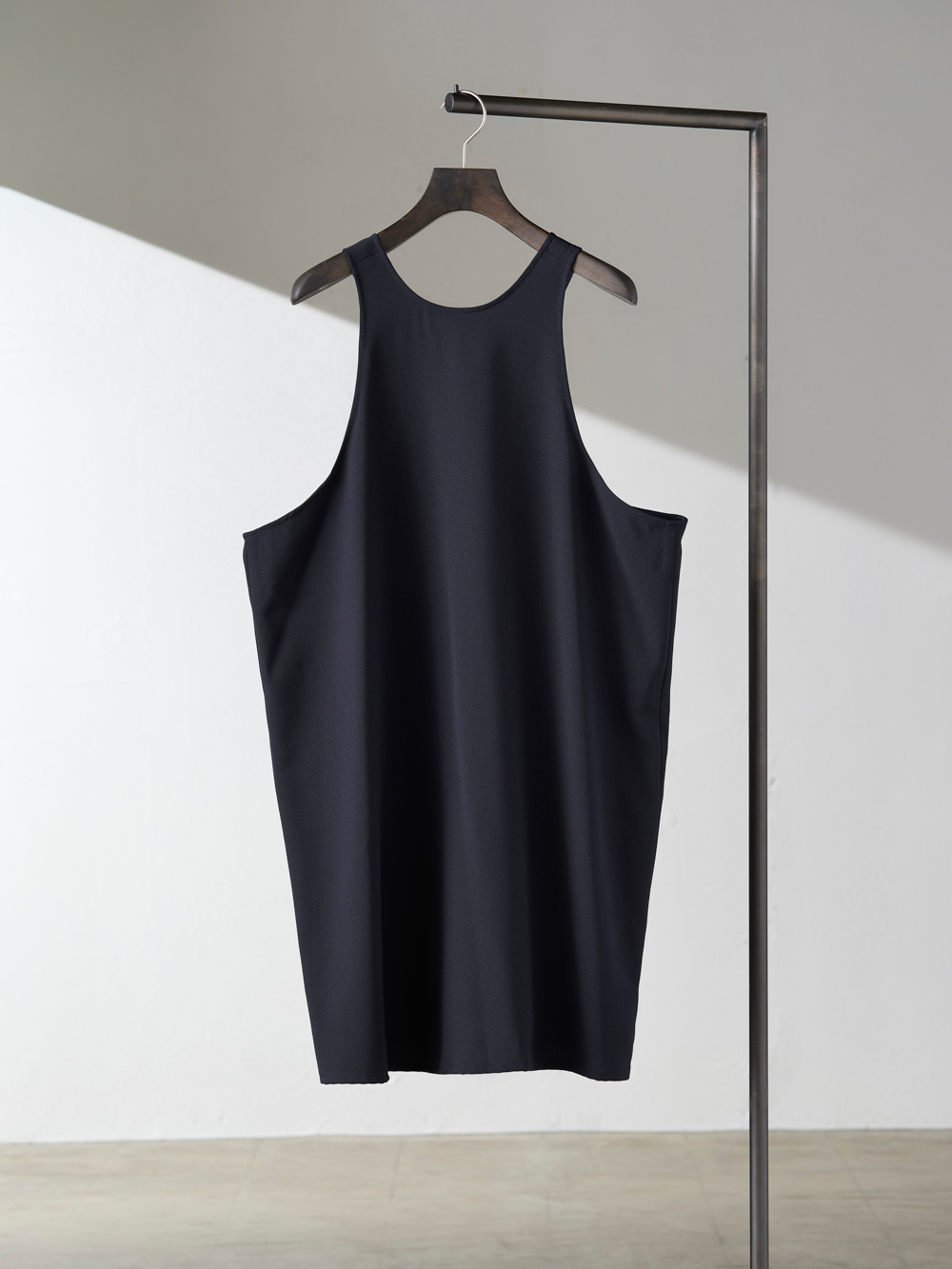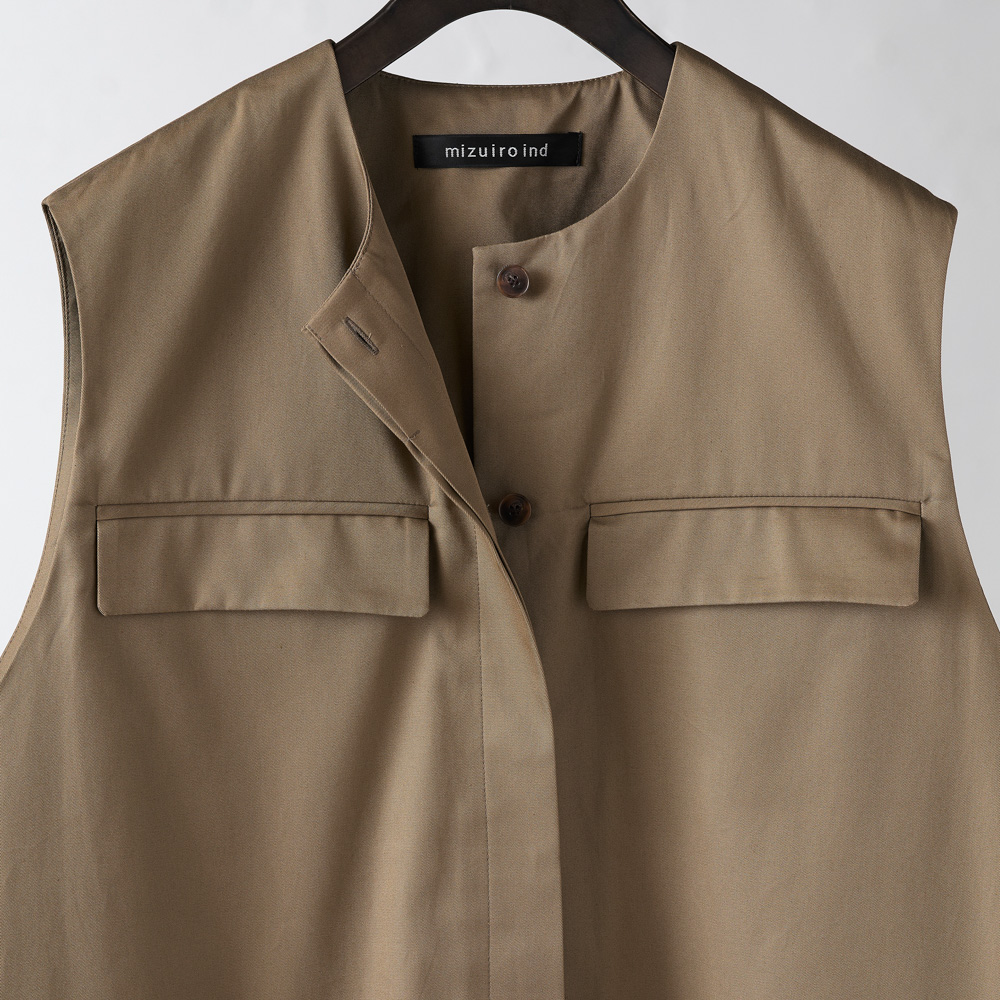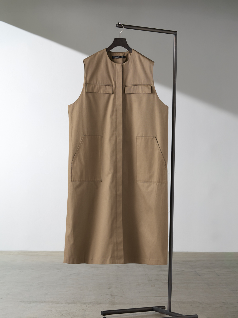 ワークスタイルをベースにしたフラップポケットやパッチポケットが印象的なデザインです。ジャケットの袖を大胆にカットしたような袖のラインもポイント。ジレとしても、ワンピースとしても着られるので幅広いスタイリングにフィットします。しっかりハリのあるコットン素材を活かしたマニッシュさが魅力のアイテムです。