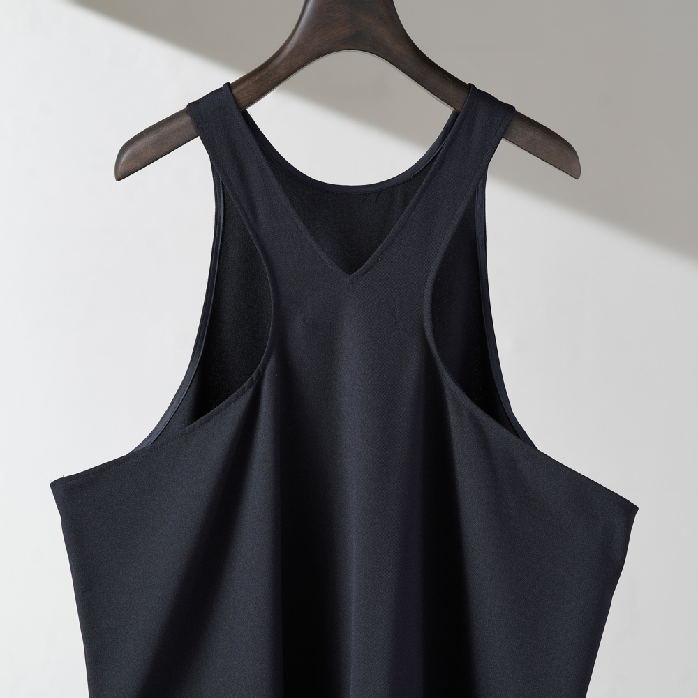 前後でカッティングを変えているバックスタイル。無駄を省いたシンプルなシルエットですが、サイドには着用すると美しいラインを描くドレープがデザインされています。