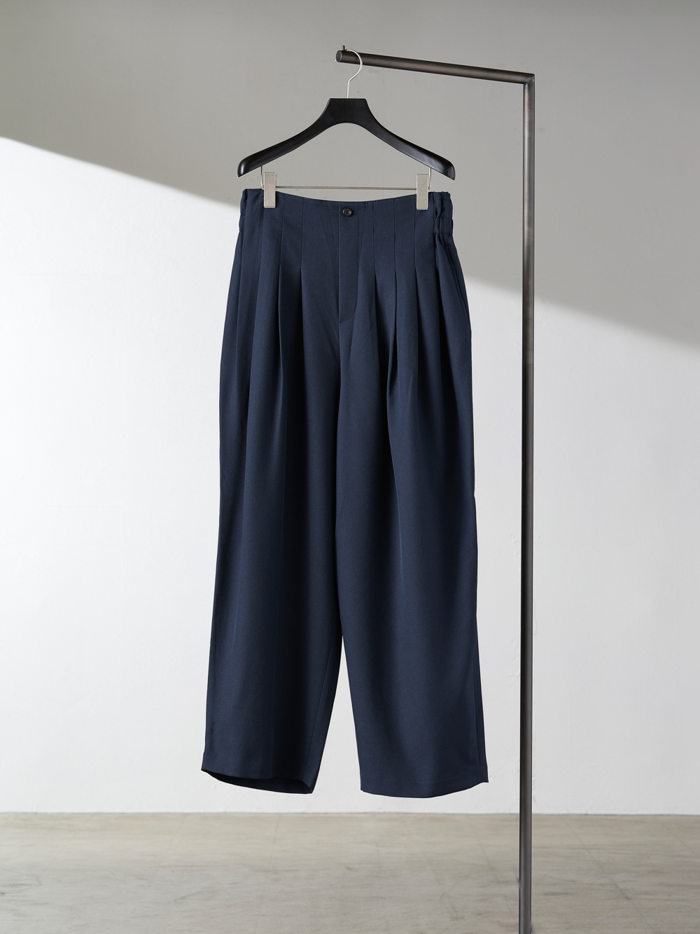 春夏シーズンにも人気のタックパンツが秋冬バージョンでリリースに。ウエスト周りはすっきりしたハイウエストで、腰下にデザインしたタックのゆとりでリラクシングな履き心地。フロントはボタンが1ヶ所ですっきりと。バックスタイルがギャザーになっているのが履きやすいポイントです。