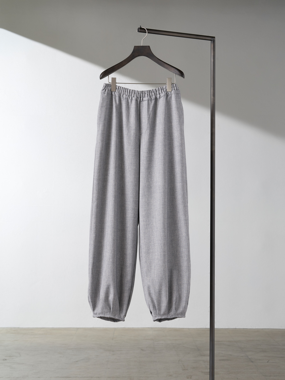 ウールのような生地感のキレイめ素材に、スポーティミックスした一着です。ウエストはボクサーパンツからインスパイアされたゴム仕様で、フィット感も快適。内側には紐もついているので調整もしやすい設計です。やや長めの丈感で、裾のタックでややクッションさせるようなデザインに仕上げています。