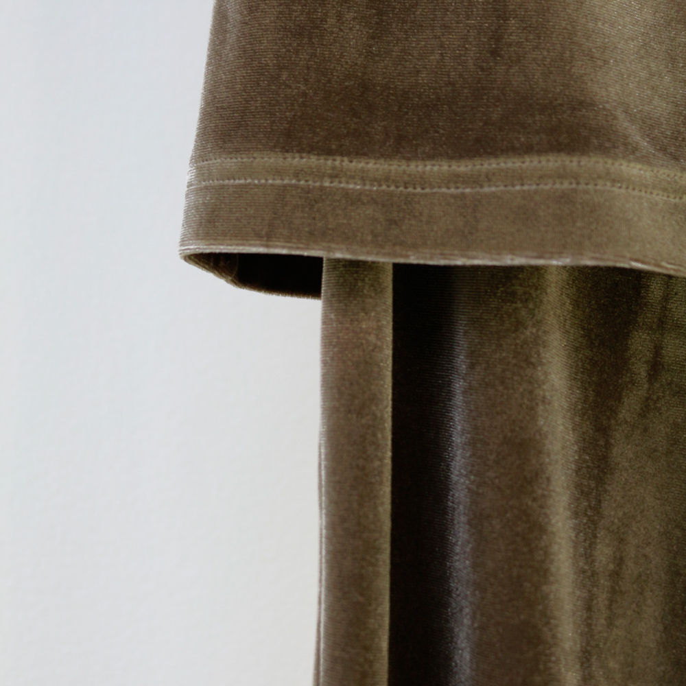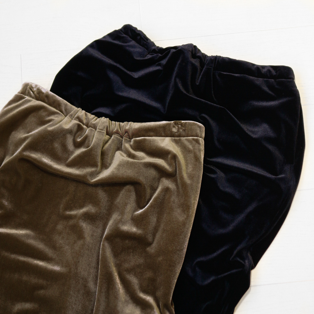 艶やかな光沢と奥行きのあるベロアの質感が魅力。しなやかな落ち感がシルエットを引き立て、秋冬スタイルを上品に彩ります。合わせるトップス次第で印象を自在に変えられるので、コーディネートの可能性がさらに広がります。