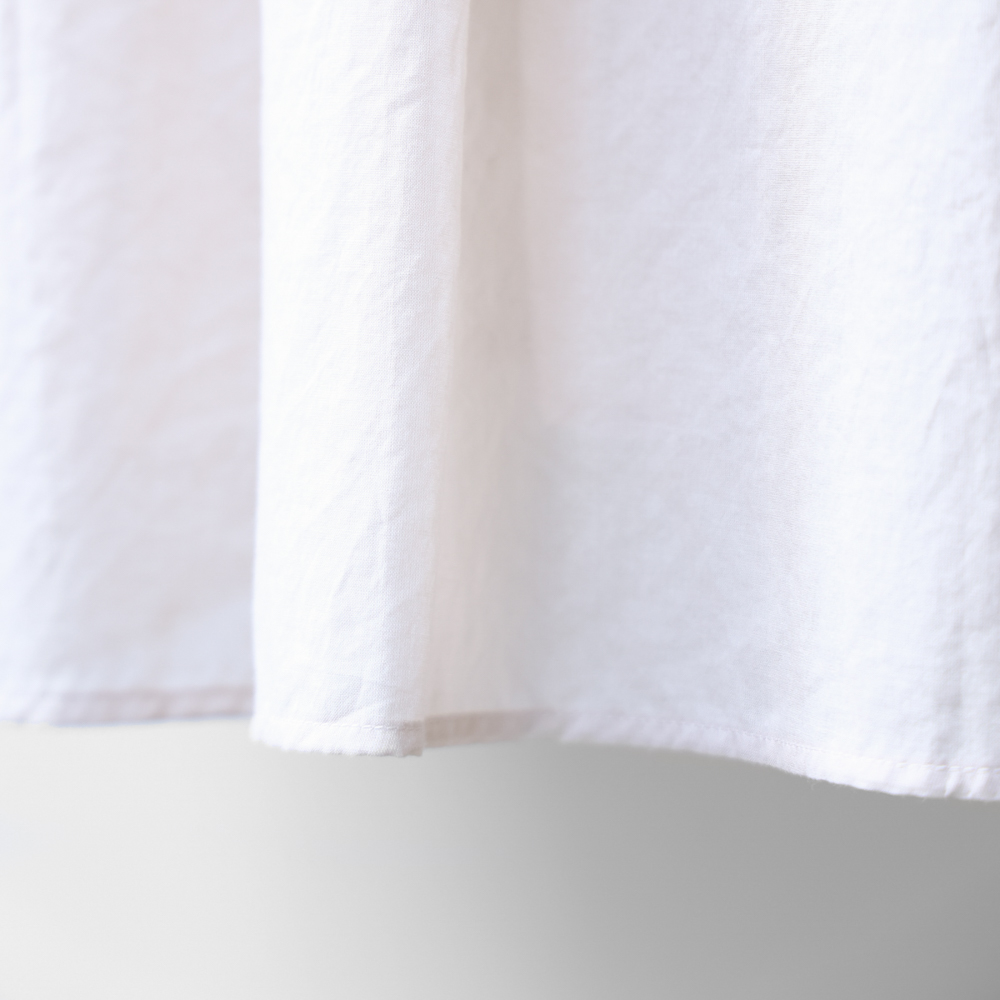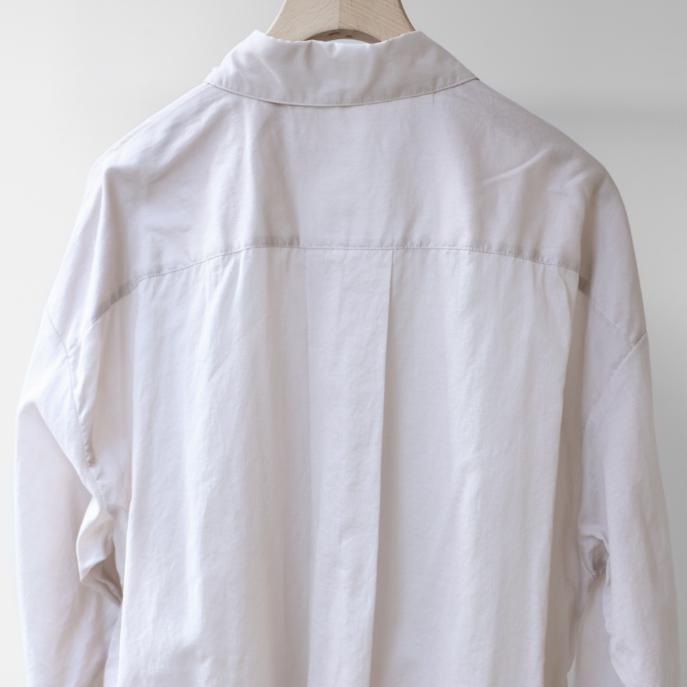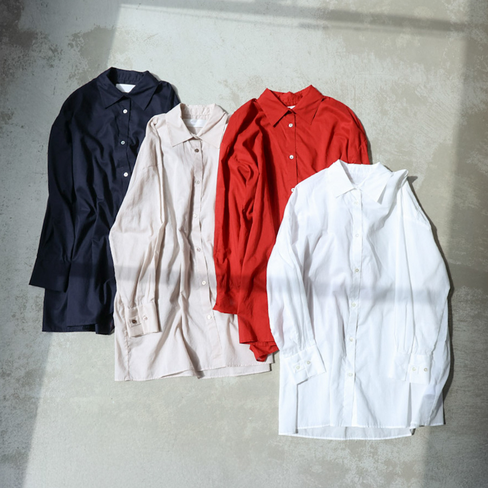 着丈80.5cmで腰回りをすっぽりとカバーする長めのワイドシャツ。ドロップショルダーが柔らかな印象とリラックス感を演出します。ボタンをきっちり留めればきちんとした着こなしに、袖をまくればラフな羽織としても活躍。軽やかな着心地でレイヤードもしやすく、シーンやコーディネートに合わせて自在にアレンジできる一枚です。