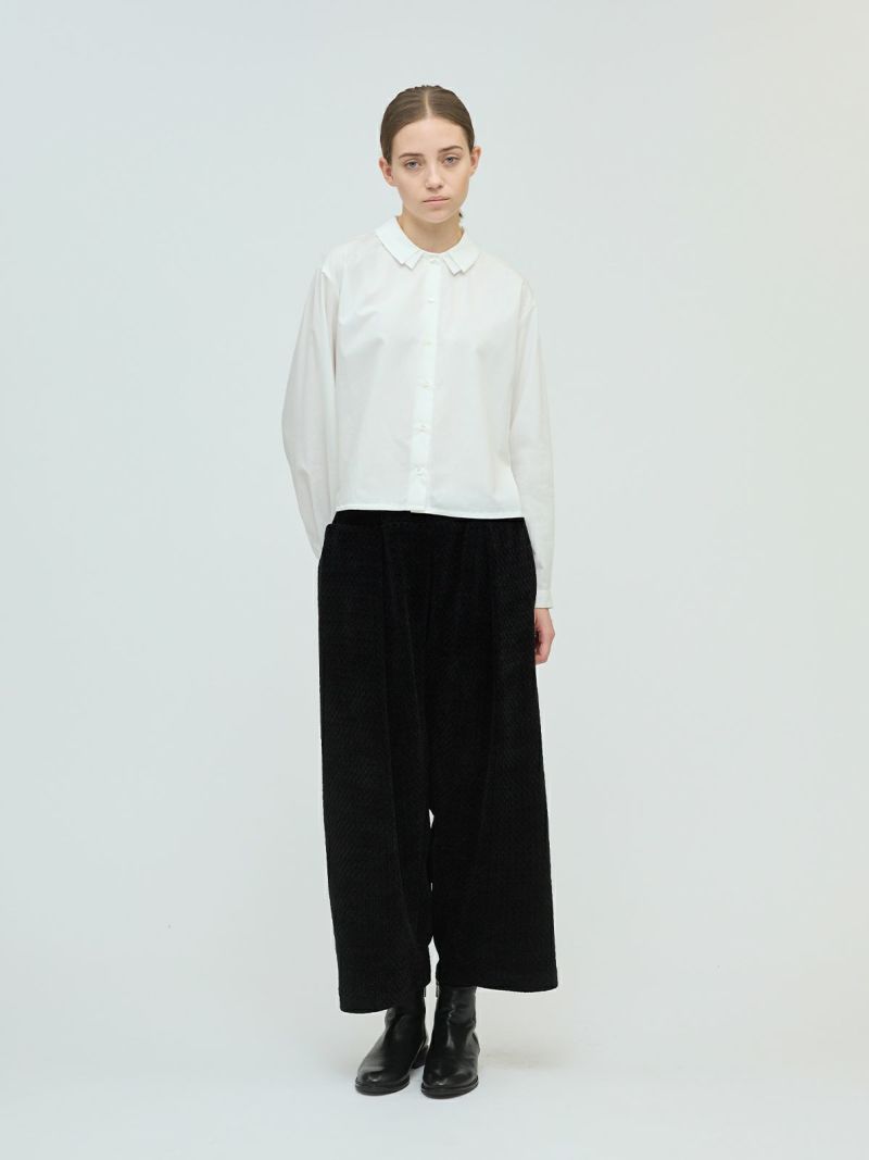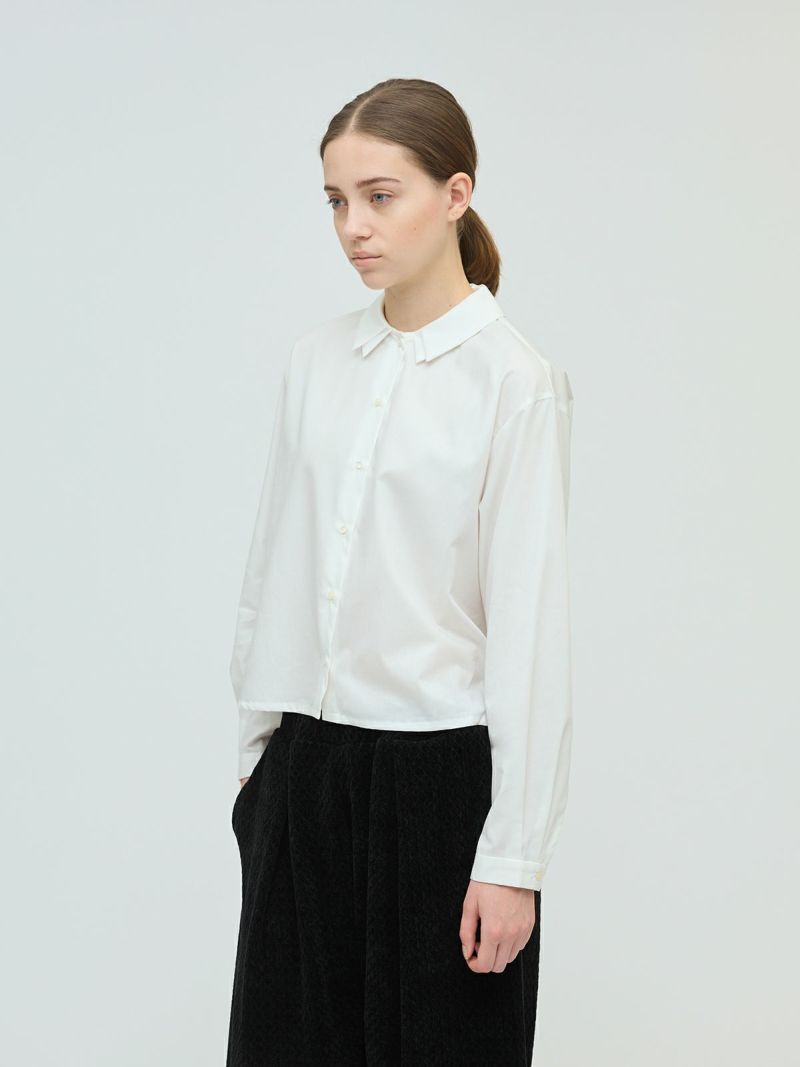 ワイドでショート丈バランスが取りやすいバルーンシルエットが印象的なシャツです。ぷっくりとした丸みあるシルエットで雰囲気のあるスタイルを演出。張りのある軽やかな素材感で季節の変わり目に活躍します。