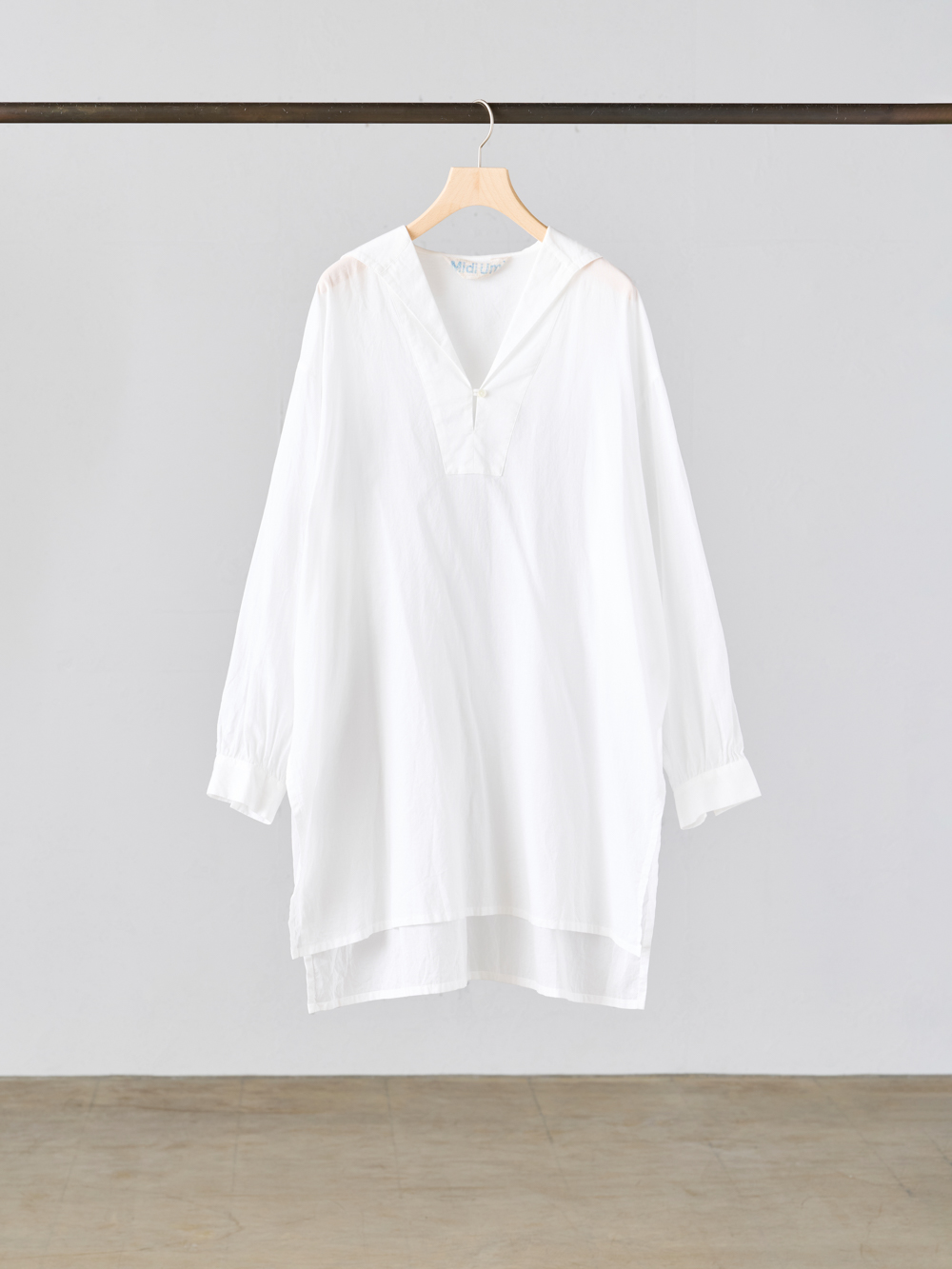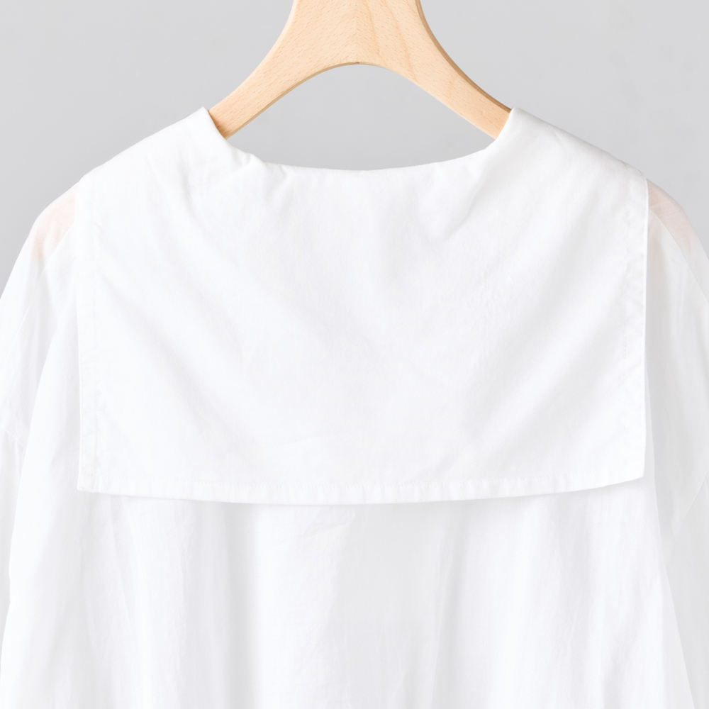 繊細でなめらかな手触りのローン素材とセーラーカラーがマッチした上品なアイテムです。ヴィンテージのワークスモックのようなデザインと味わいのある雰囲気が融合。合わせるインナーやボトムス次第でスタイリングが変化し、着こなしを楽しめる一着です。