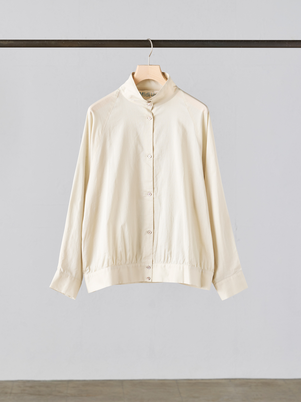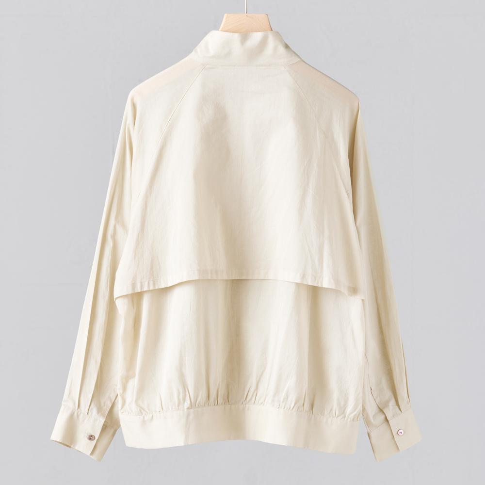 細い糸で織られたローン素材が上品なシアー感を与えてくれます。シャツのようにも、スイングトップのようにブルゾンとしても着られて、軽快に表情を変えるのが魅力です。ラグランスリーブや裾のギャザーなどカジュアルな味付けのデザインに仕上がった、気負いなく羽織れるトップスです。