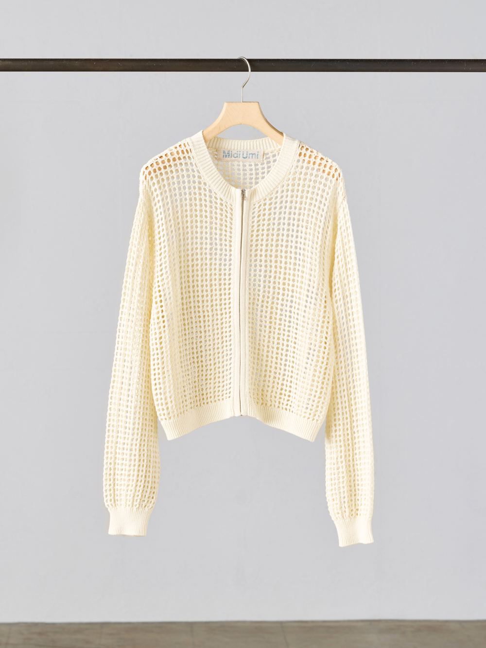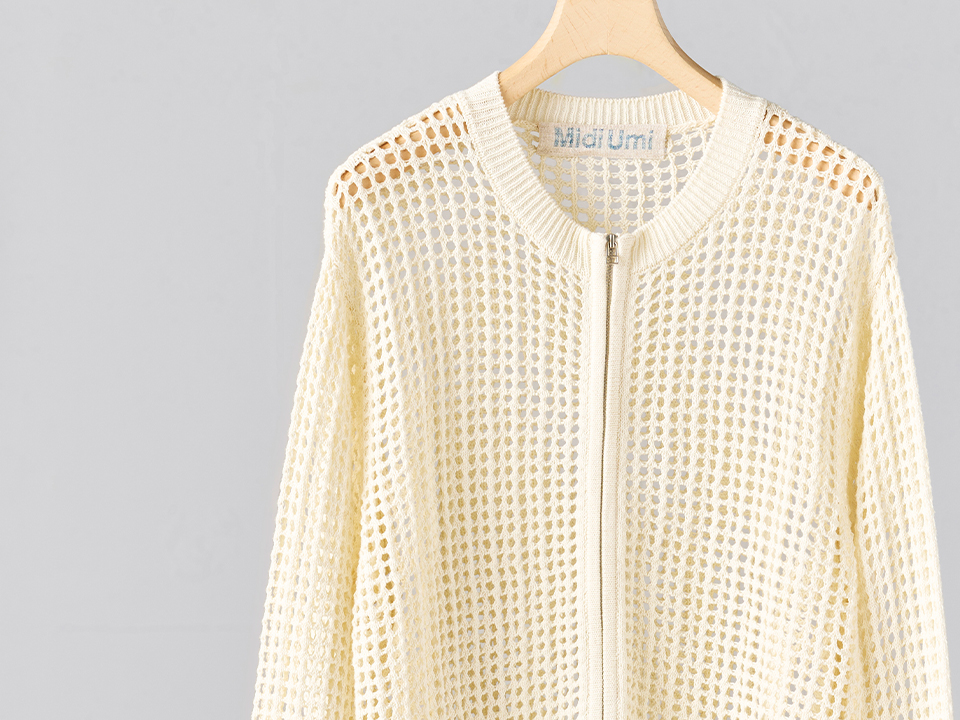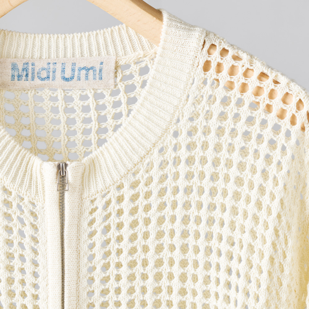 編み目が大きめのメッシュ地がカジュアルなイメージ。クルーネックのシンプルな作りですが、フロントのシルバージップや襟元のリブ仕様がポイントに。