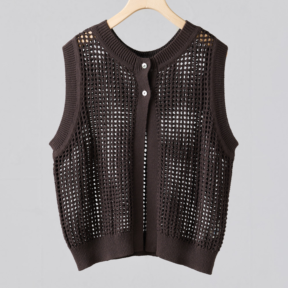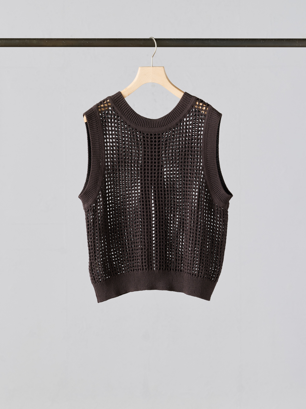 春夏シーズンにも人気だったニットベストの編み柄を変更した、秋冬バージョンが登場です。よりシンプルな格子の編み目で、まだまだ気温の高い時期に半袖やノースリーブとレイヤードしても着られる通気性のよいベスト。秋以降には、シャツやワンピースと合わせた重ね着もおすすめです。