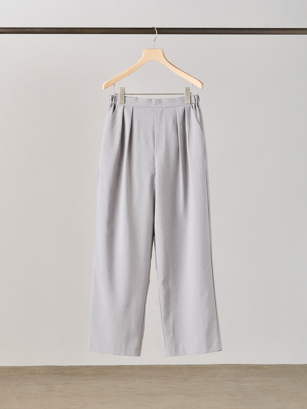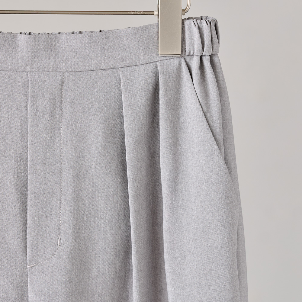 ウエスト左右に2本ずつタックをとったワイドシルエット。高級感のある素材でキレイめな印象とコントラストをなすリラックスできる履き心地。ウエスト正面はフラットでバックはゴム仕様。ゆったりはけるシルエットがこなれて見えるスラックスです。同素材でシルエットの違うセンタープレスタイプもおすすめ。