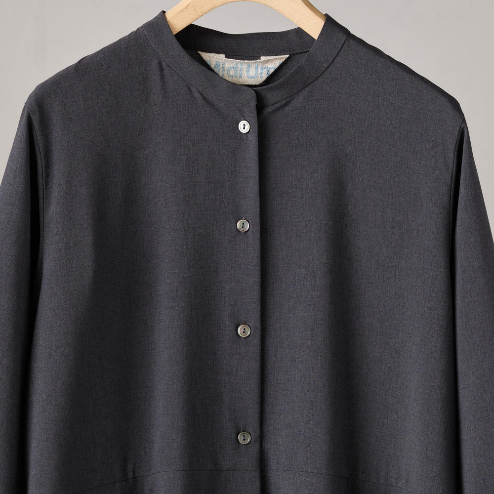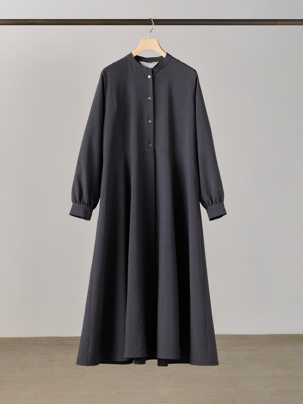 ウエスト切り替えの美しいAラインシルエット。リサイクルポリエステルを使った、シワになりにくい素材が魅力です。縦に落ち感のある素材で、身頃や袖周りはコンパクトめ、スカート部分にかけてキレイなフレアラインが出るデザインです。シンプルなスタンドカラーも◎。