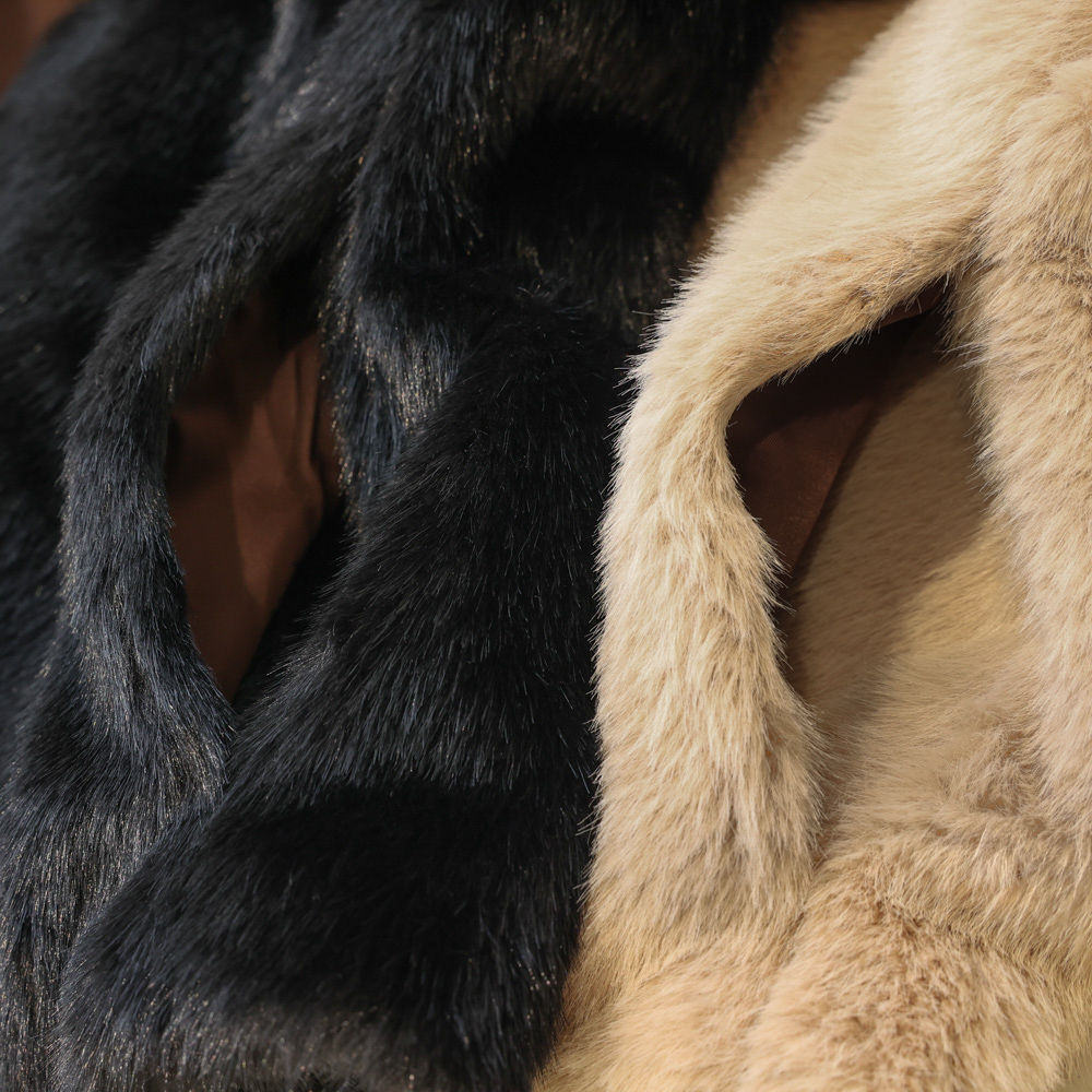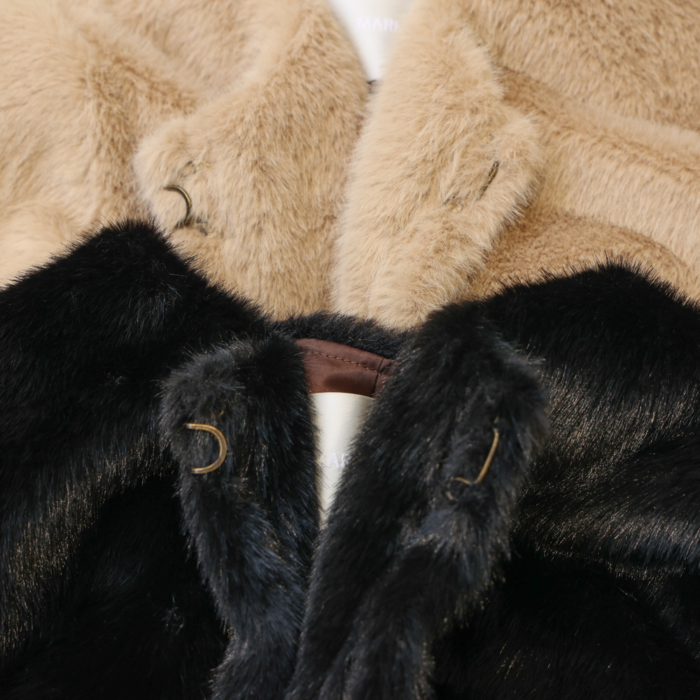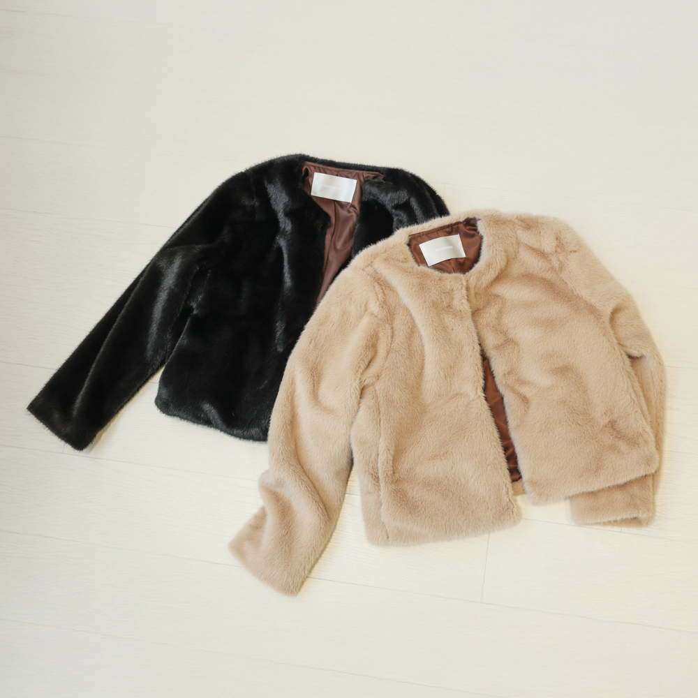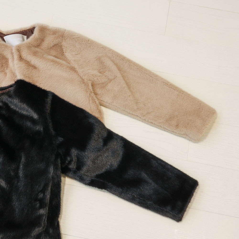 首元すっきりのノーカラーデザインで、大人の上品さを演出。カラーはベージュとブラックの2色展開。どちらも定番に着回しやすい万能カラーです。フェイクファーの柔らかさが、コーデに華やぎを添えます。