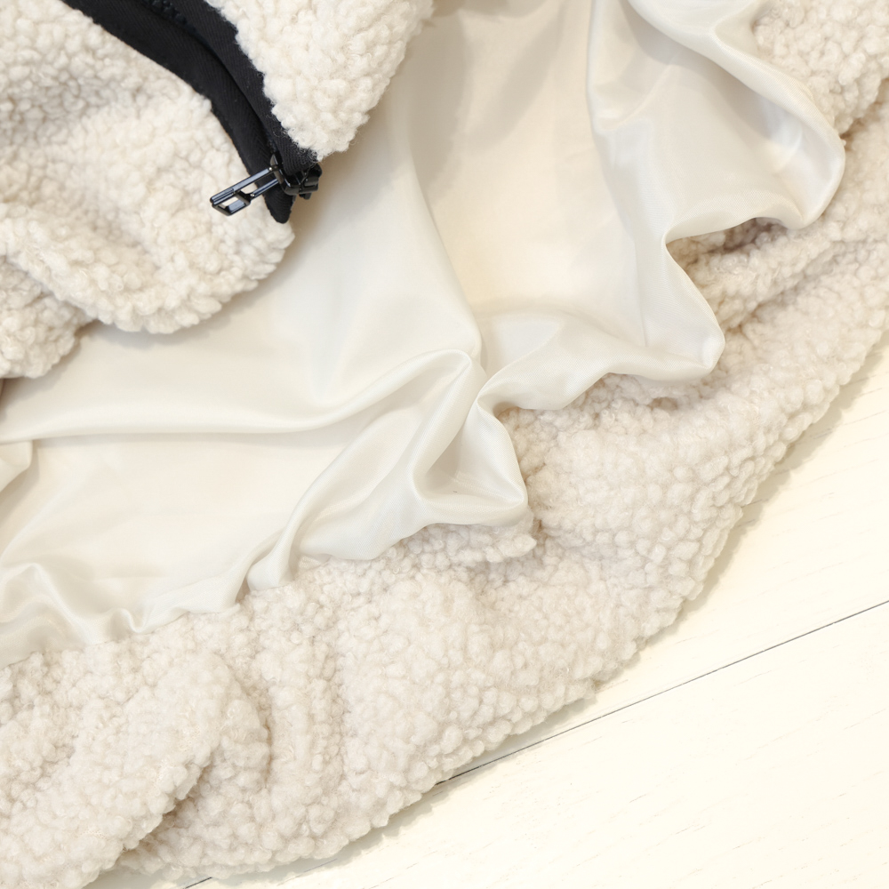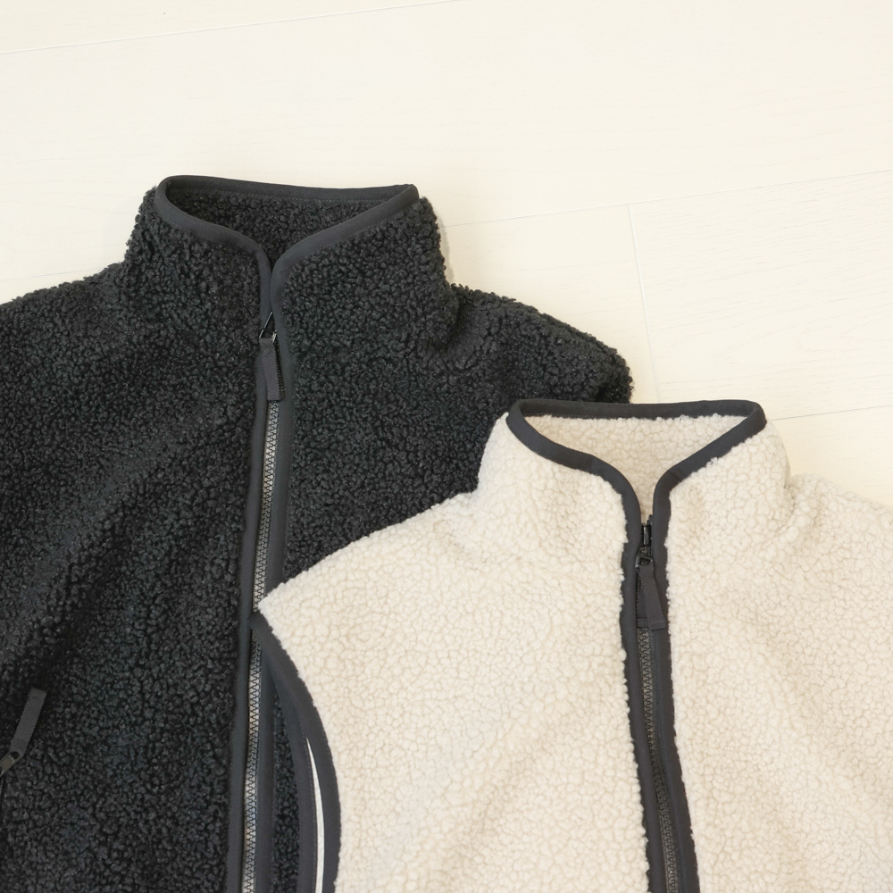 やわらかなボア素材を、パイピングで引き締めた一着。スタンドネックのデザインが首元まであたたかく包み込み、すっきりとした印象を与えます。温もりのある風合いと洗練されたディテールの対比が、MARMARMARらしいバランスを生み出します。