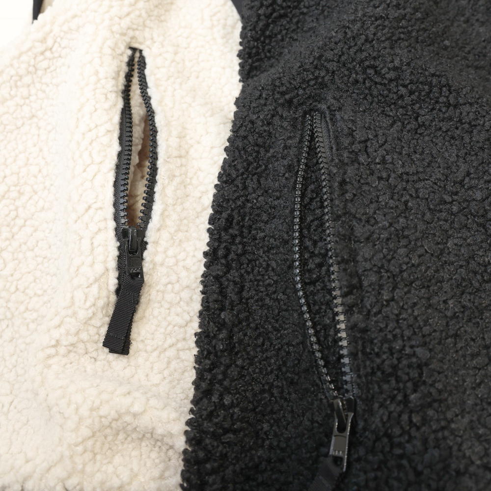 柔らかなボアの風合いを都会的に仕立て、軽く羽織るだけで季節の装いに奥行きを生み出します。前後のボリューム感が特徴で、ざっくりとしたコーディネートもおすすめ。軽量ながらしっかりとあたたかく、レイヤードを楽しめる一着です。