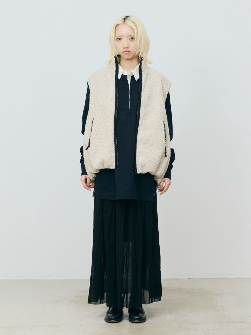 柔らかなボアの風合いを都会的に仕立て、軽く羽織るだけで季節の装いに奥行きを生み出します。前後のボリューム感が特徴で、ざっくりとしたコーディネートもおすすめ。軽量ながらしっかりとあたたかく、レイヤードを楽しめる一着です。