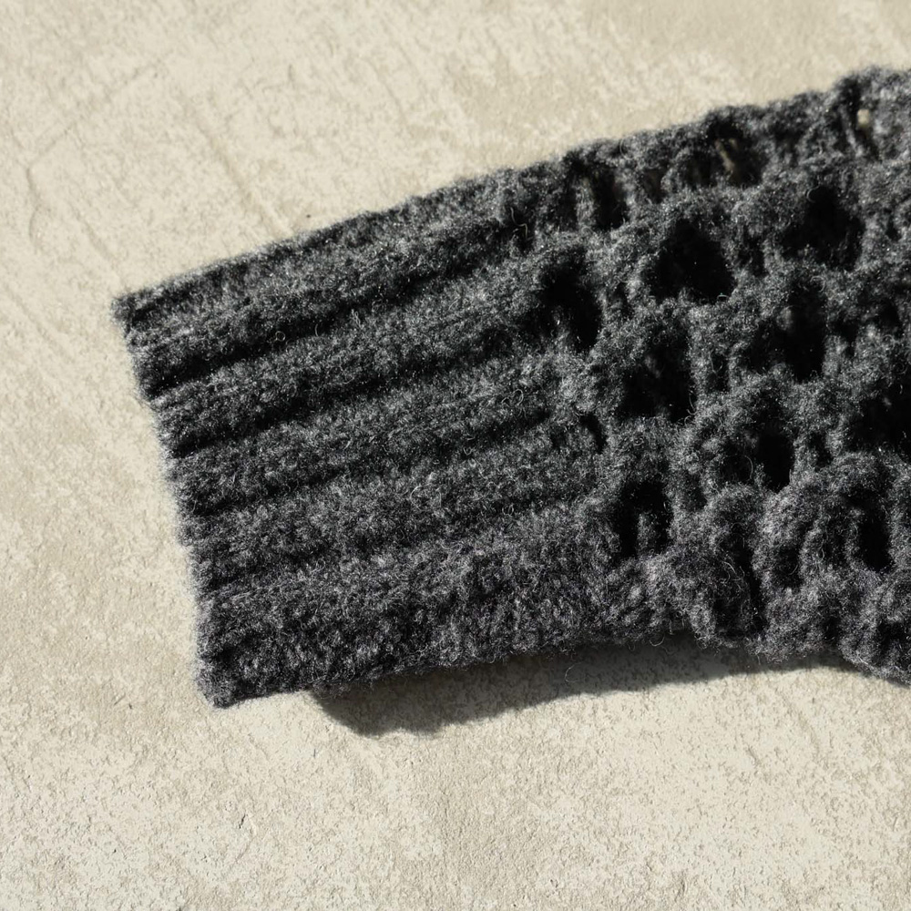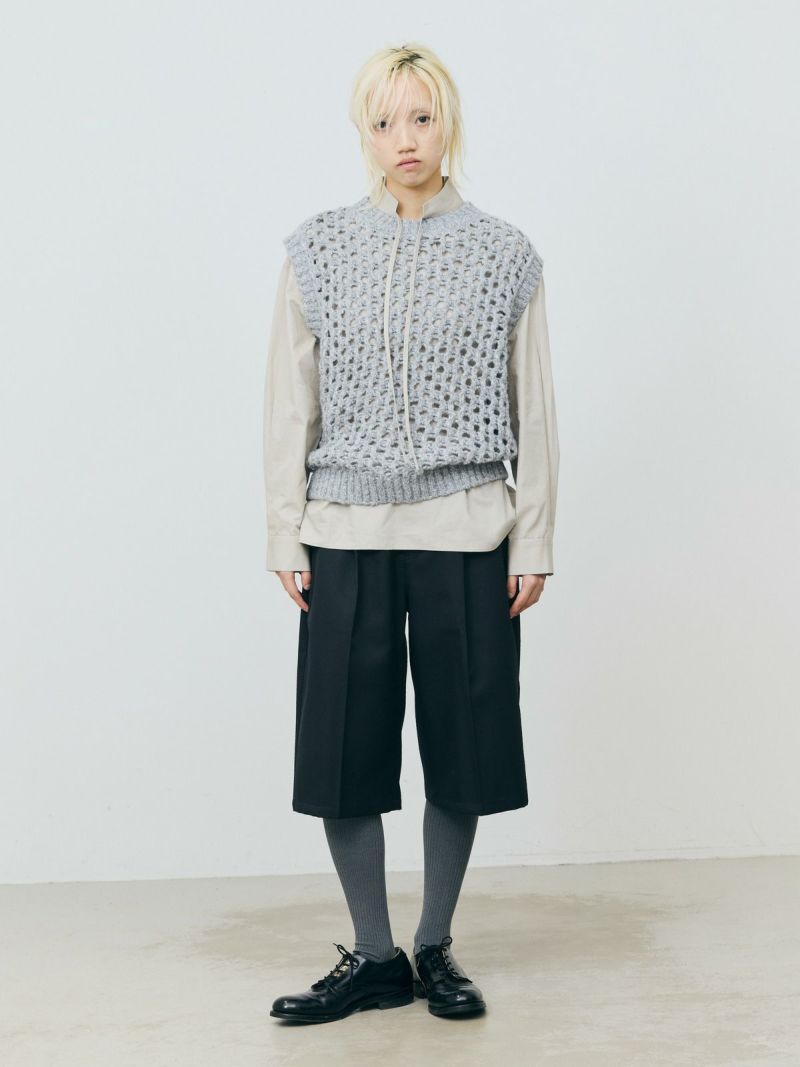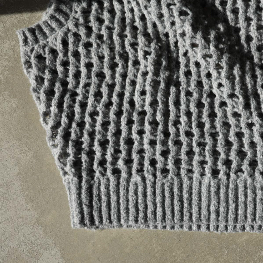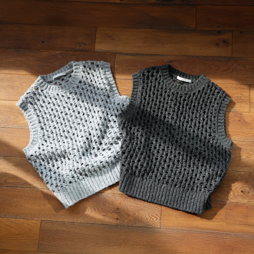 ウール混の編み地で丁寧に編み上げたメッシュベスト。素材の温もりと軽やかな透け感が調和し、合わせるインナーによって印象の変化を楽しめる一枚です。秋冬の重くなりがちなコーディネートに、ほどよい軽やかさと抜け感を添えます。