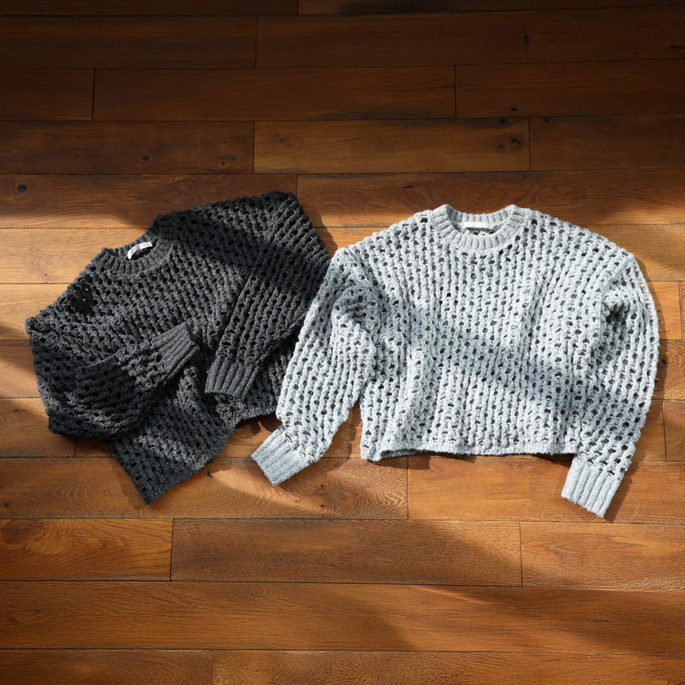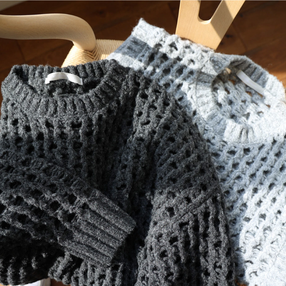 レイヤードスタイルにおすすめのローゲージメッシュシリーズです。大きめの編み目からインナーがのぞき、抜け感のある印象に。肉厚な編み素材が立体的なシルエットをつくり、季節の変わり目からシーズンを通して長く活躍するニットアイテムです。
