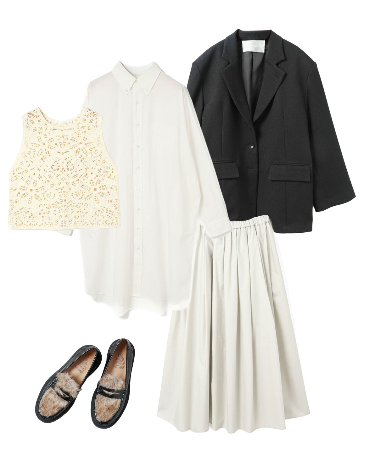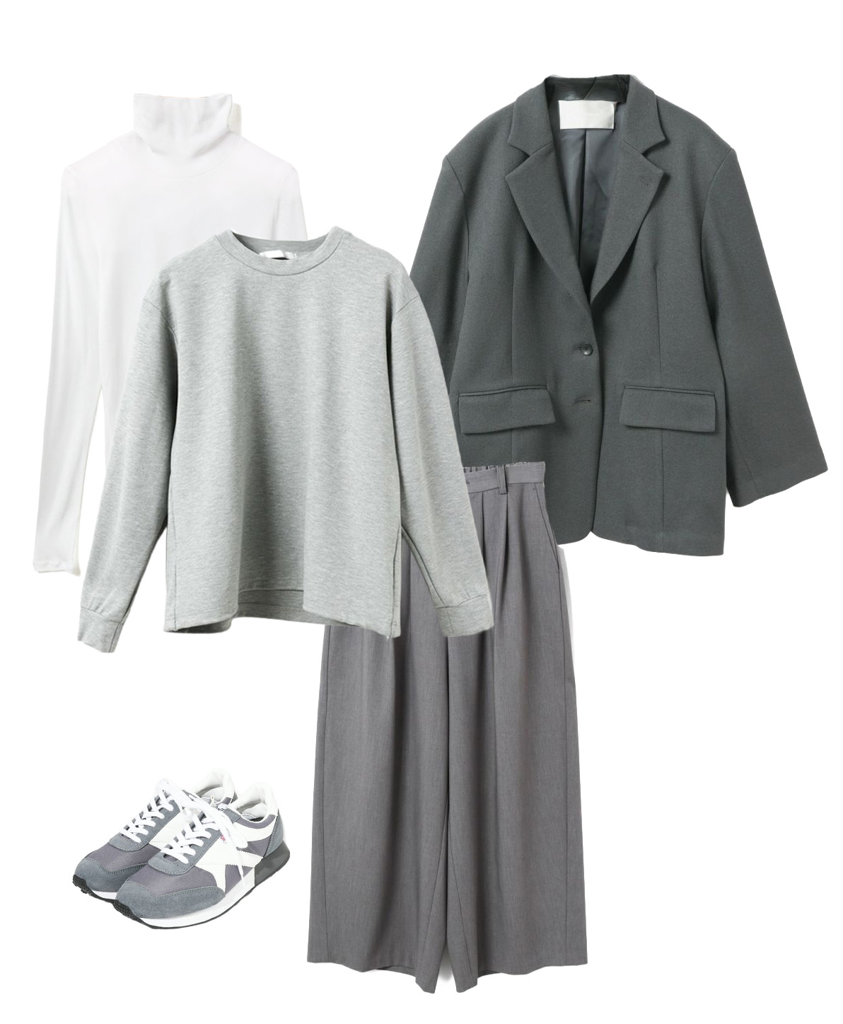 軽めの肩パッドを入れることで、ほどよく構築的なラインを描き、全体をすっきりと見せています。肩のラインがすっきりと見えることで、オーバーサイズながらも洗練されたバランスに仕上がっています。