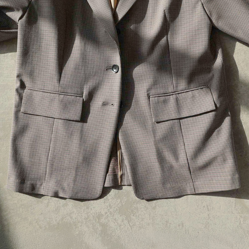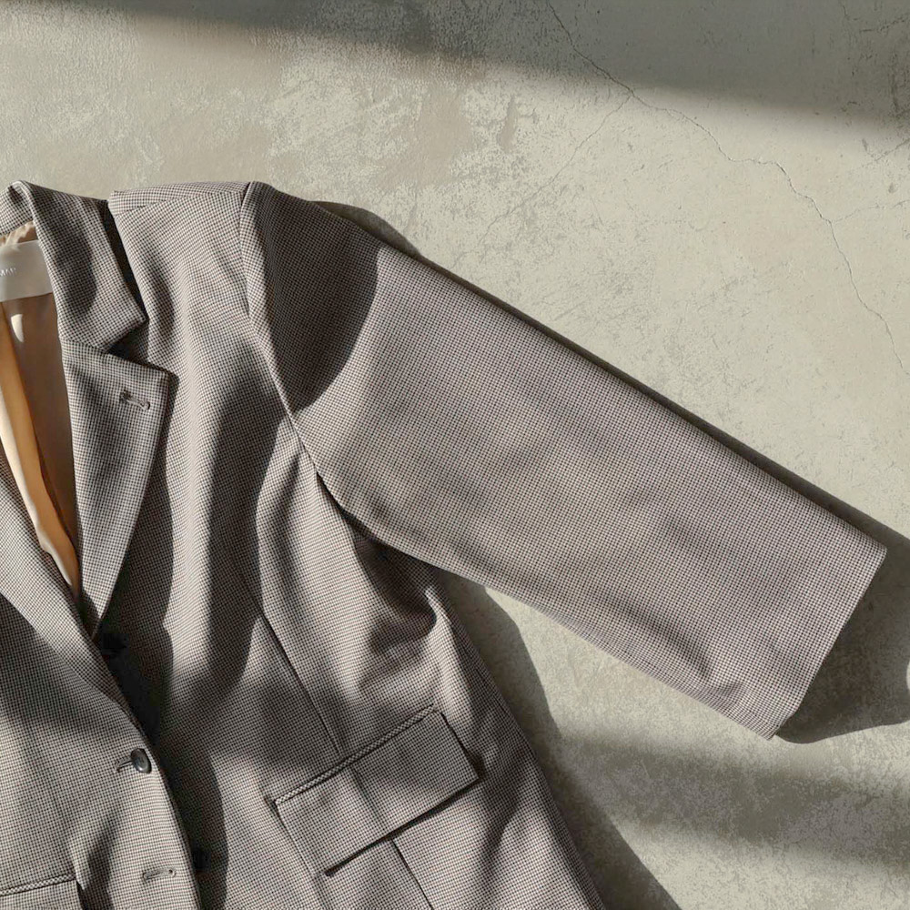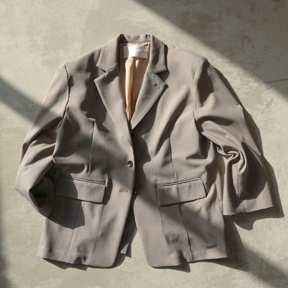 やや広めにとったラペルが印象的。シンプルな中にほどよい存在感を添え、落ち着いた雰囲気を引き立てます。ボックスシルエットで仕上げ、フロントは三つボタン仕様。第二ボタンを留めて着ることを想定したデザインです。