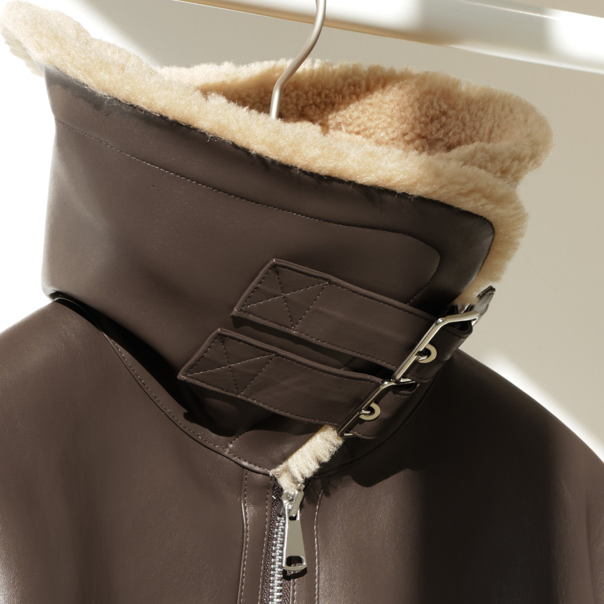 程よいボリュームのあるボアがデザインの魅力を引き立てる、存在感たっぷりのフェイクレザームートンジャケット。滑らかな合皮素材ならではの上品な光沢が、冬の装いにさりげないリッチさを添えてくれます。