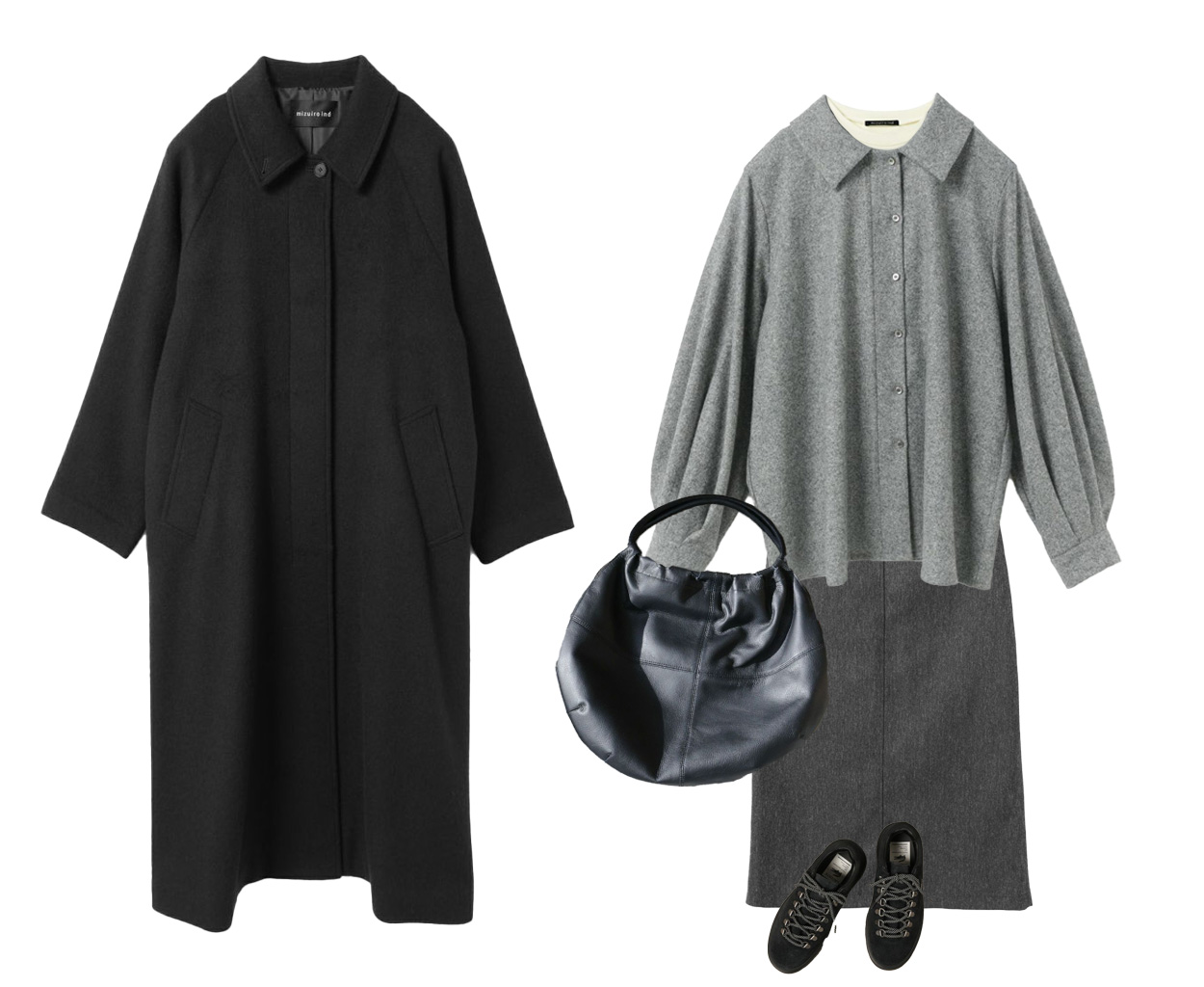 黒とグレーのコントラストで魅せる、洗練された大人のモノトーンスタイルです。バルーンスリーブがポイントの温かなウールシャツに白のカットソーを合わせたレイヤードで暖かさを演出。ボトムスはツイード素材のタイトスカートを合わせて上品に仕上げました。丸みのある黒のレザーバッグとスエードスニーカーが程よい抜け感をプラスします。アウターには、シンプルながらもオーバーサイズで存在感のあるバルマカーンのロングコートを羽織り、都会的な冬の着こなしが完成。