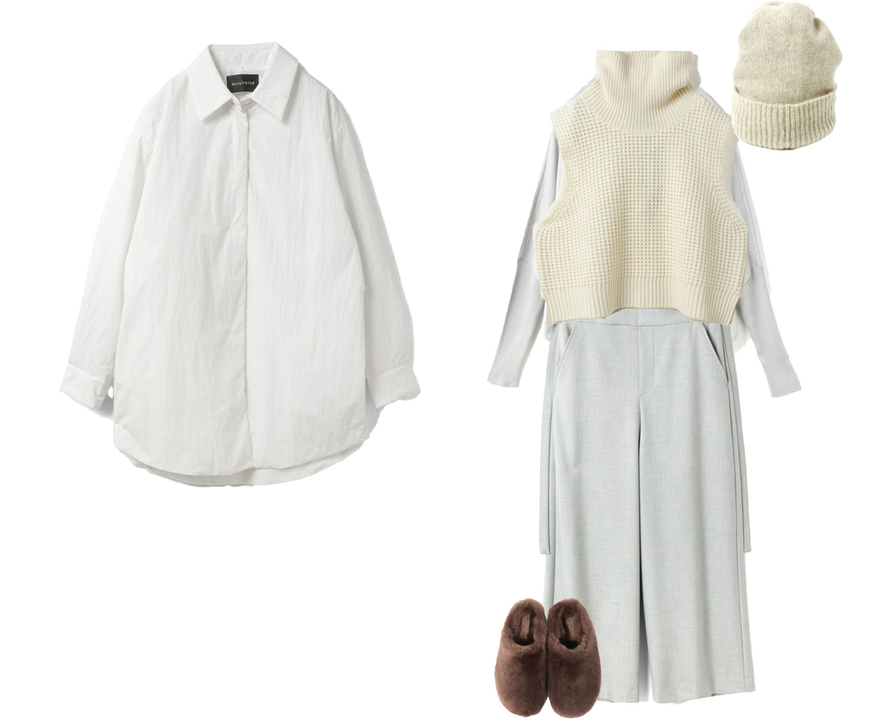 ホワイトを基調にした爽やかな大人のスタイル。ライトグレーのニットにワッフルのハイネックベストを合わせ、温かく柔らかな印象を演出。ボトムスにはマリンルックをベースにした同色系のワイドパンツが爽やかさをプラスし、軽やかな印象に仕上げてました。アウターにもホワイトのシャツをベースにしたクリーンで温かなouterをチョイス。足元はファーサンダルで抜け感を調節し、ニット帽でアクセントを効かせた大人の洗練された冬のお出かけスタイルが完成。