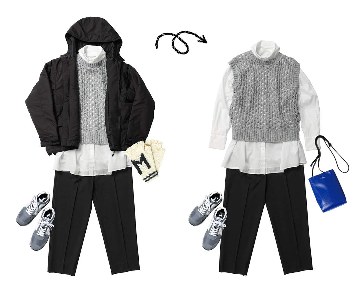 モノトーンでまとめた大人のカジュアルスタイル。保温性のある中綿入りインシュレーションコートを合わせ、ブルーのバッグをさりげないアクセントに。アウターを脱いだときも映えるシャツとニットベストのレイヤードに、あえてスニーカーを合わせてほどよくカジュアルダウンしたスタイリング。