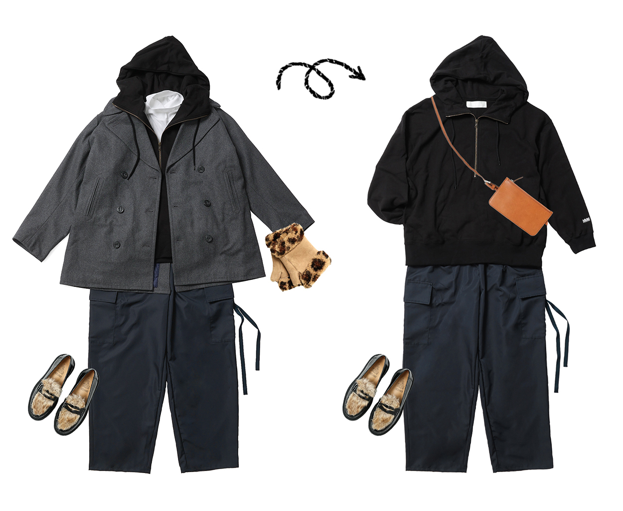 定番のピーコートにハーフジップのパーカーを重ねた、大人のメンズライクスタイル。インナーには首元に程よいニュアンスを添えるシアー素材のハイネックカットソーを合わせました。ハンドウォーマーやファーローファーで季節感と女性らしさをさりげなく添え、ハードになりすぎないバランスに。春先はパーカーとカーゴパンツを主役にした軽やかな着こなしも楽しめます。