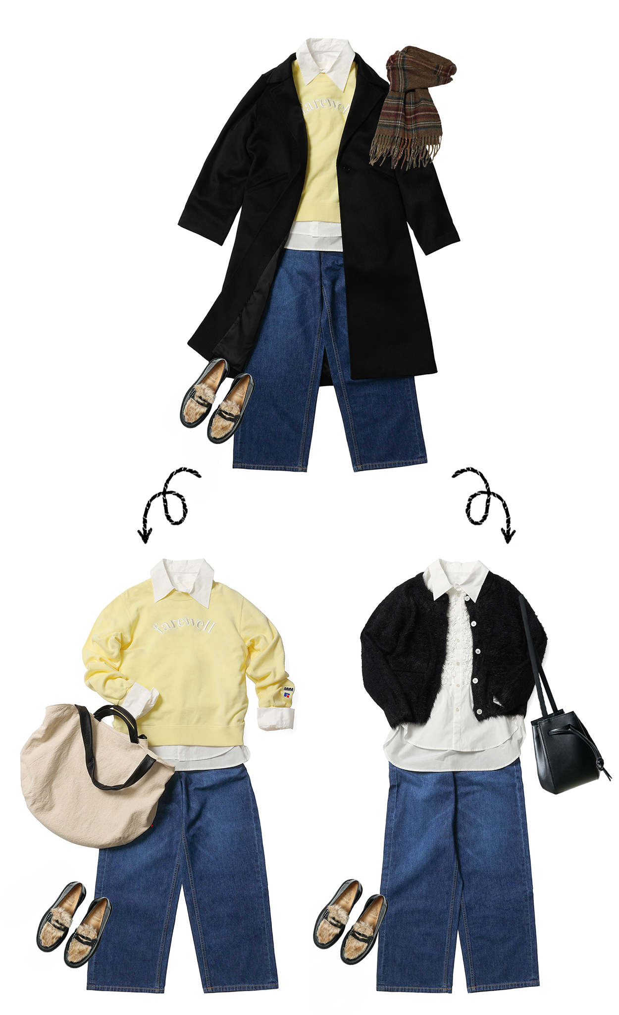 ベーシックなチェスターコートに、イエローのクルーネックスウェットを合わせた ほどよく力の抜けたきれいめカジュアルスタイル。ストレートシルエットのハイウエストデニムですっきりとしたバランスにまとめ、 足元はファーローファーで季節感を添えました。チェック柄の羊毛マフラーは、温かさと軽やかさを兼ね備えたアクセントに。イエロースウェットをシャギー素材のカーディガンに替えれば、シャツのフロントフリルがさりげなく覗き、より落ち着いた大人のムードを楽しめます。
