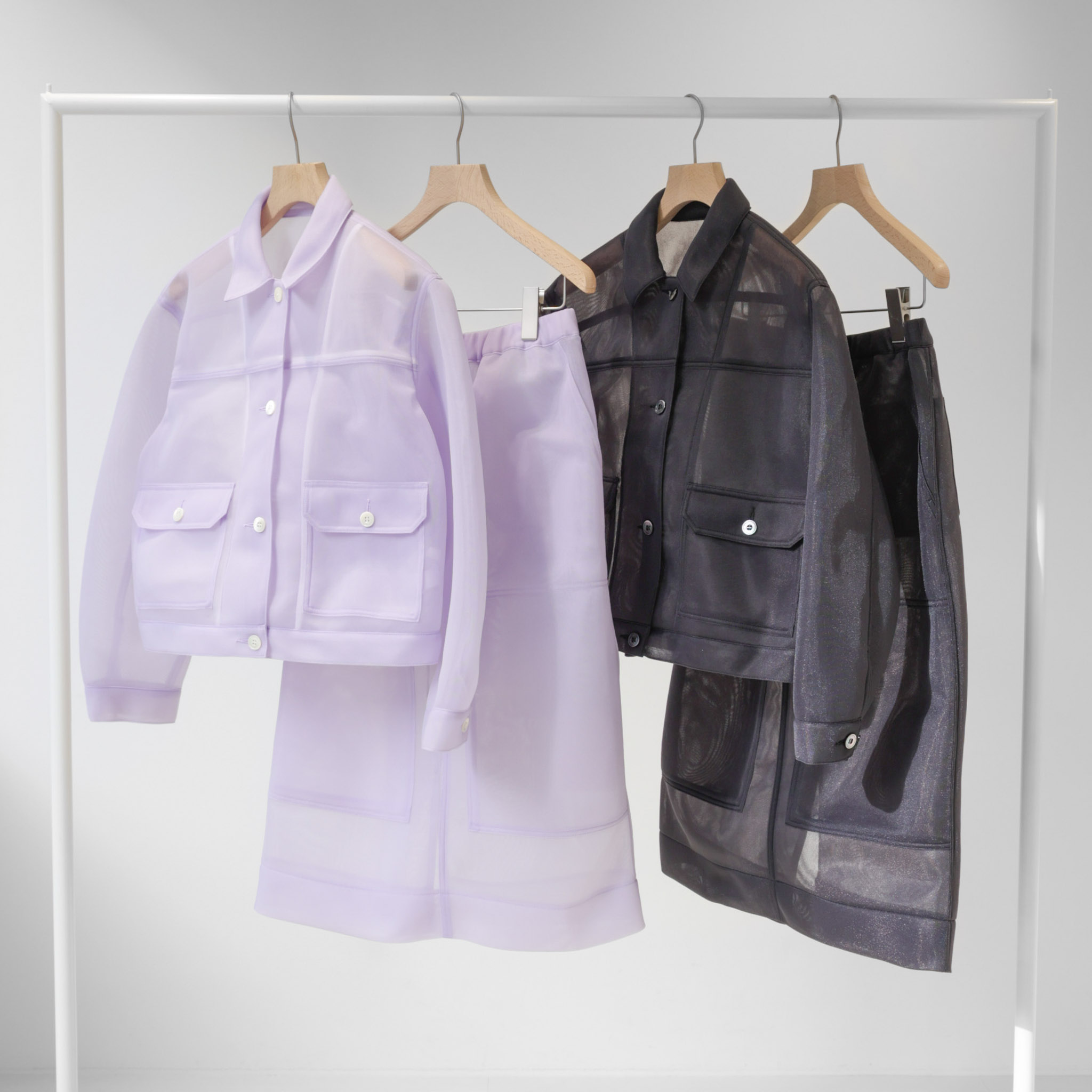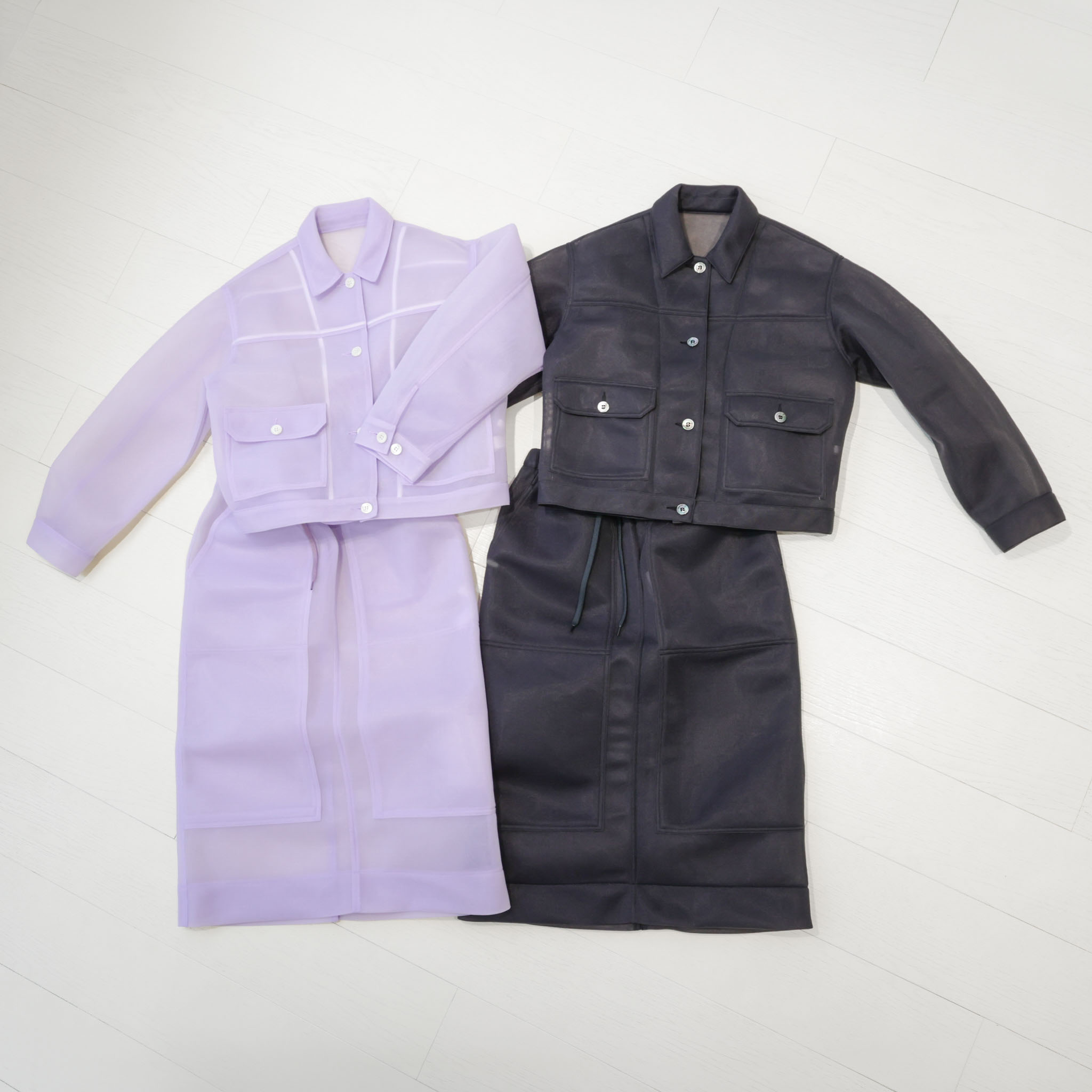 ワークジャケットとスカートをシアー素材で再構築。無骨さに軽やかさを重ね、旬のムードを纏うセットアップに仕上げました。ワークのディテールを活かしながら、今の空気を映す一着です。