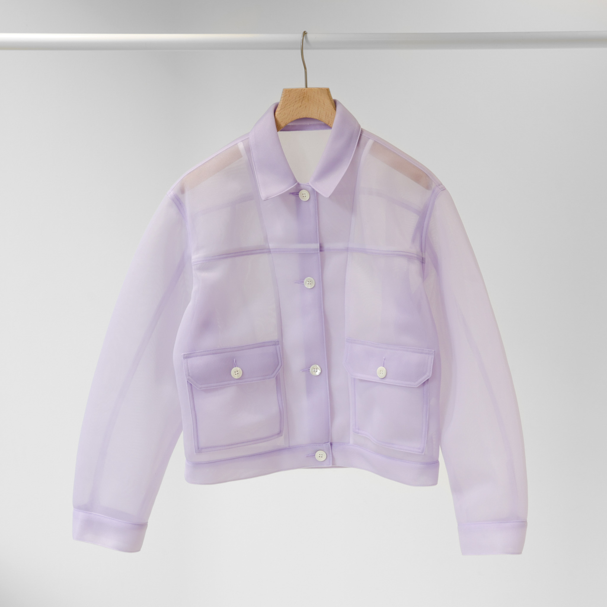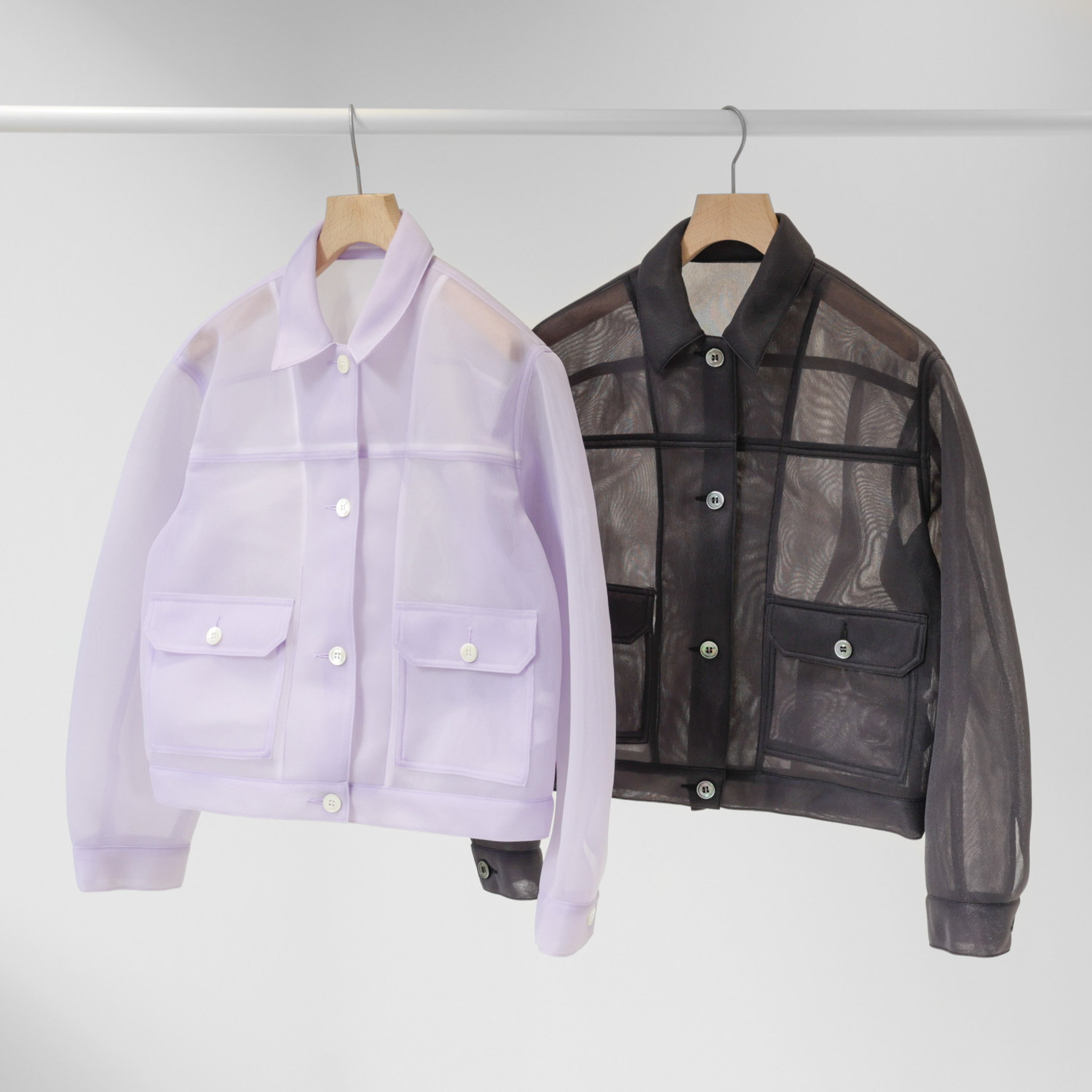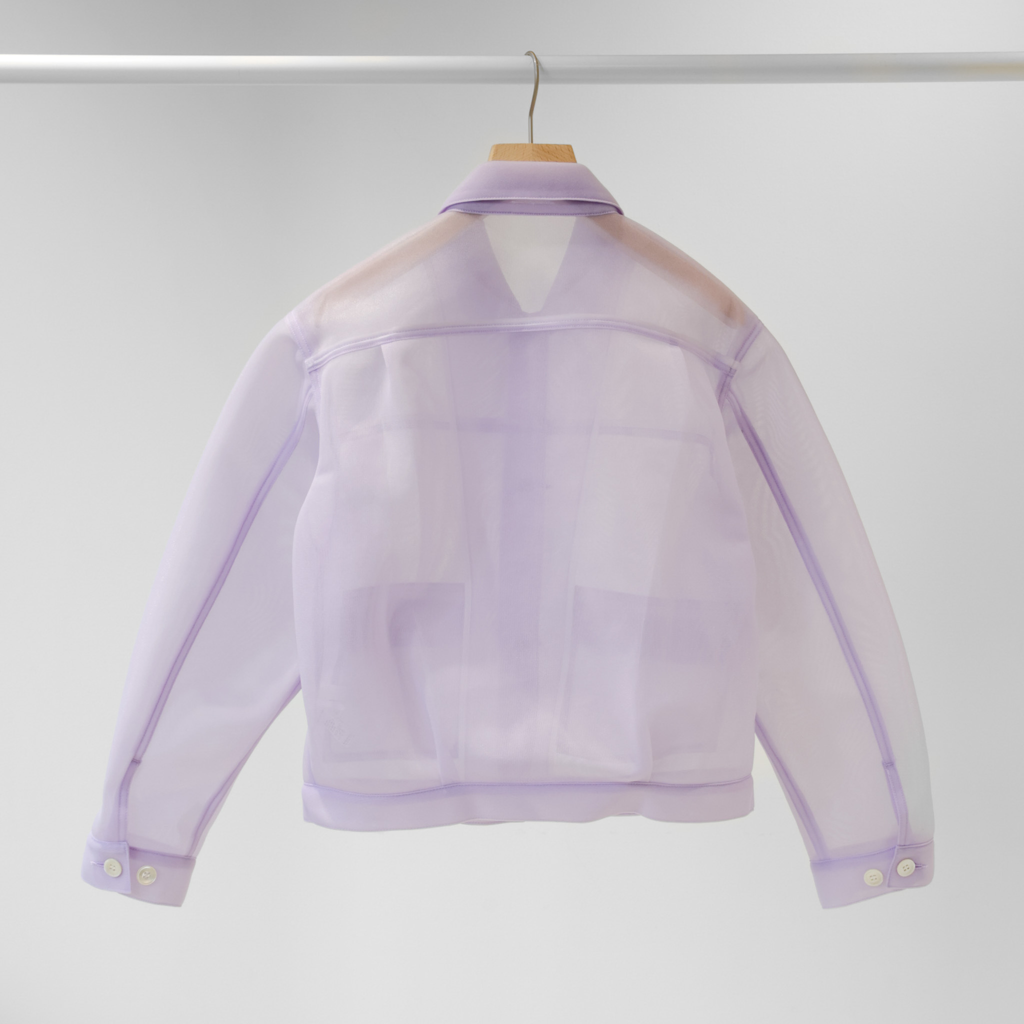 無骨なワークジャケットを、透け感のある素材で再構築。ユーロヴィンテージを思わせる立体的なフォルムと、丸みを帯びた女性的なシルエットが印象的です。肉厚なチュールを用いることで、繊細さと扱いやすさを両立しました。