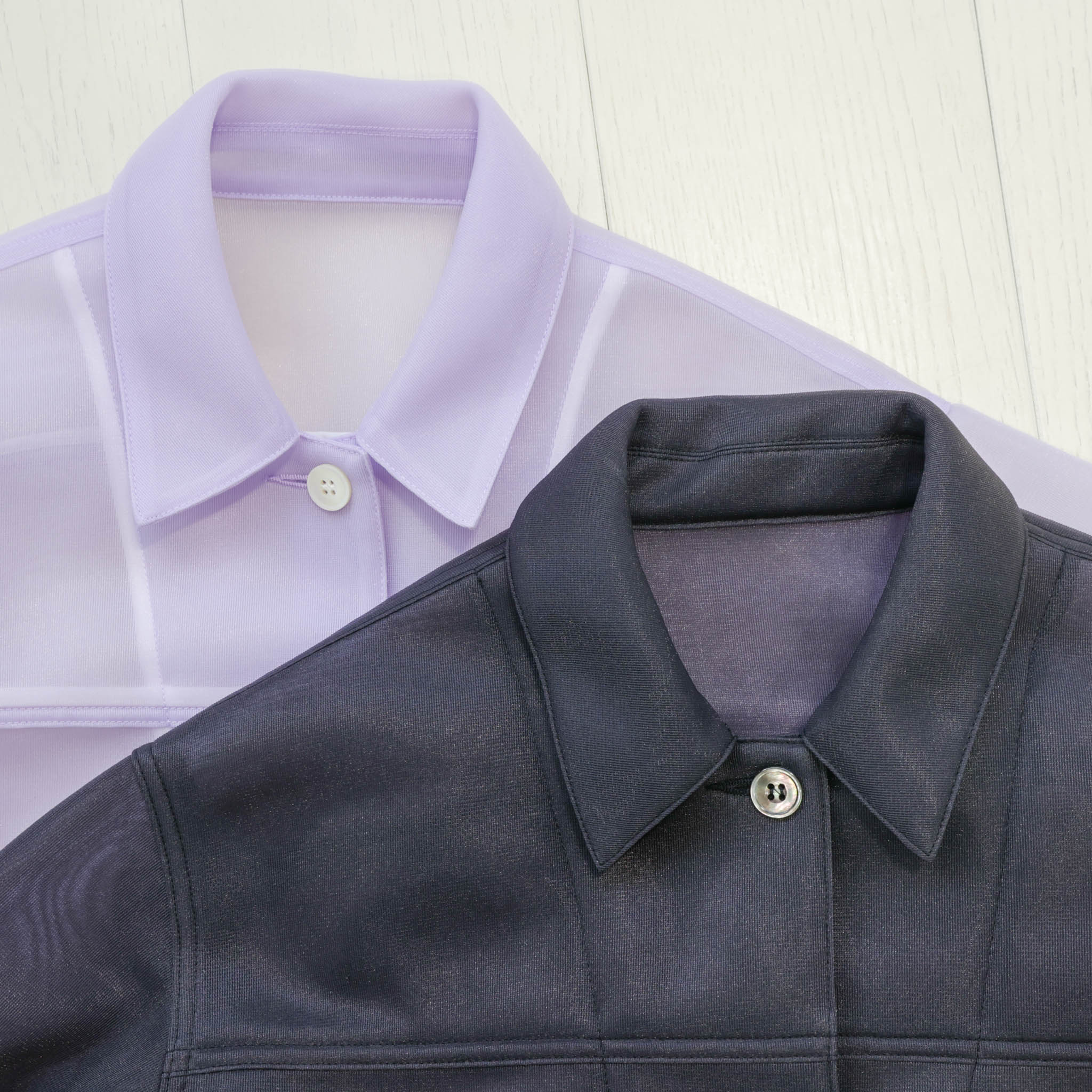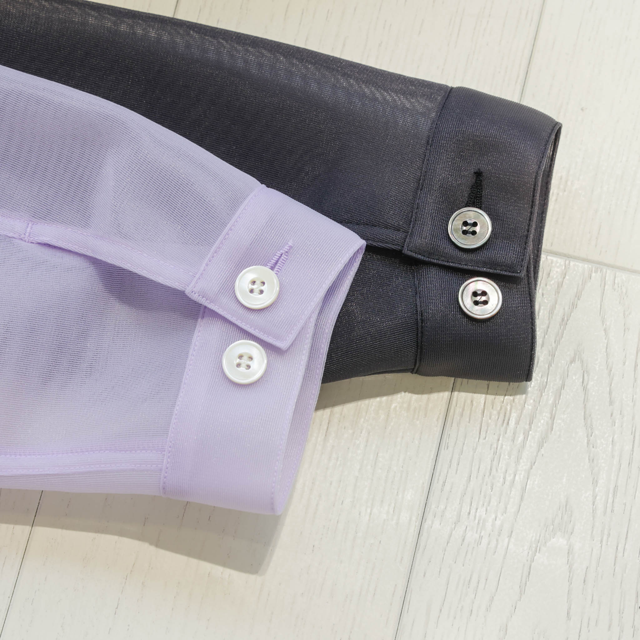 端正な襟とカフスが輪郭を引き締め、光をまとった貝ボタンが奥行きをプラス。細部まで品を感じさせる一枚です。