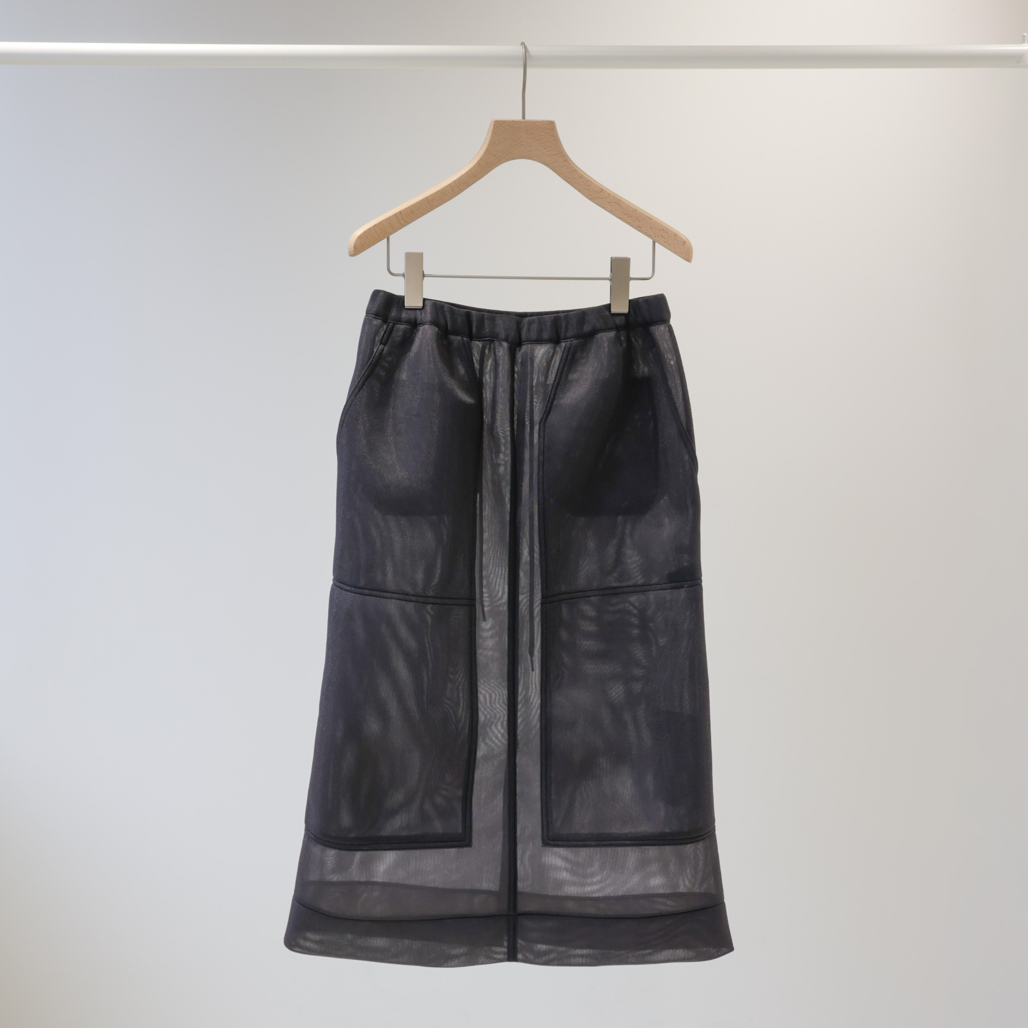ハードな印象のダブルニーパンツのディテールを、チュールでスカートに落とし込んだシアーダブルニースカート。無骨さを軽やかに転換し、まったく新しい表情に仕上げました。