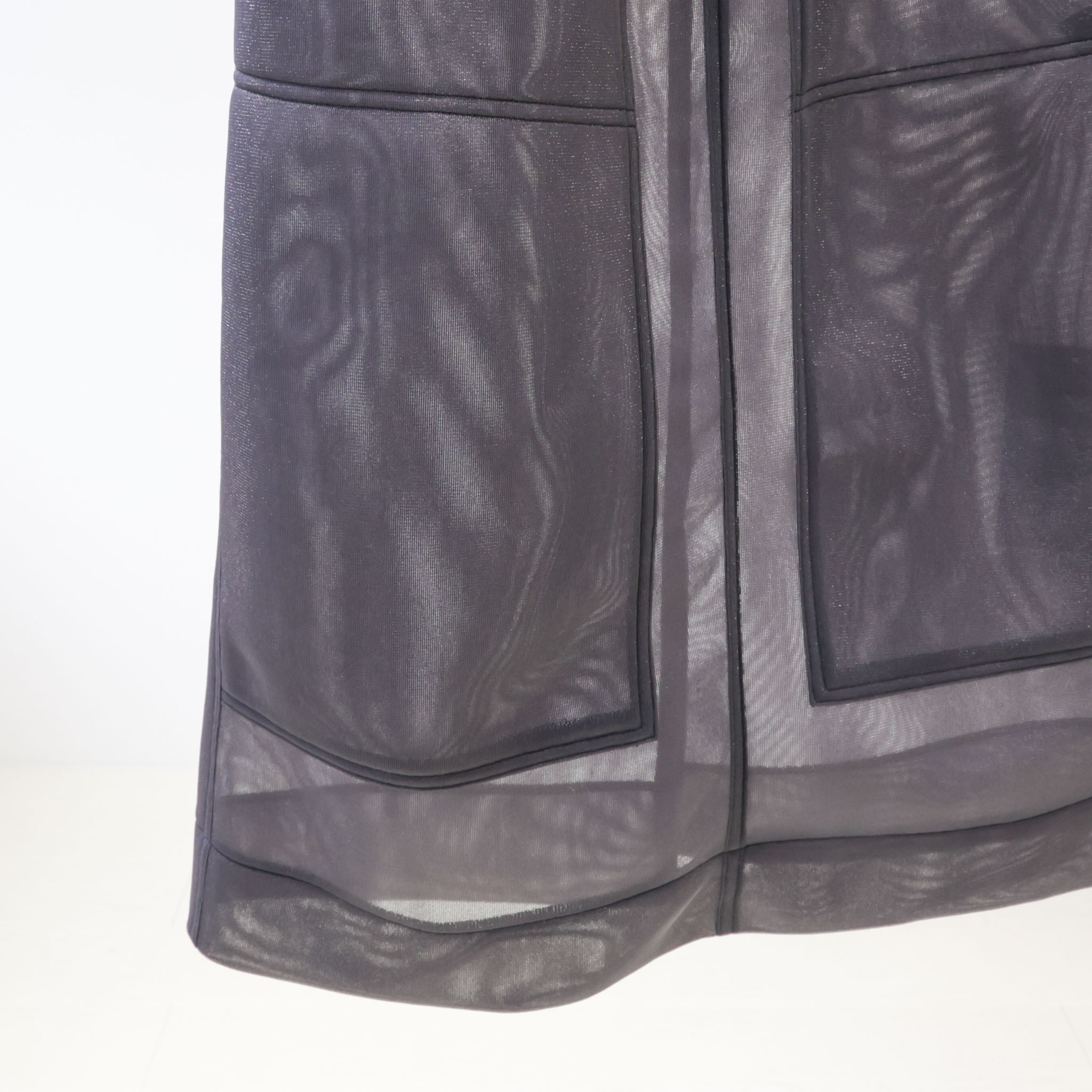 繊細なチュールのレイヤーを重ね、直線的なシルエットと軽やかな素材感が印象的な一枚。透け感がコーディネートのアクセントとなり、パンツとのスタイリングで自由なアレンジを楽しめます。