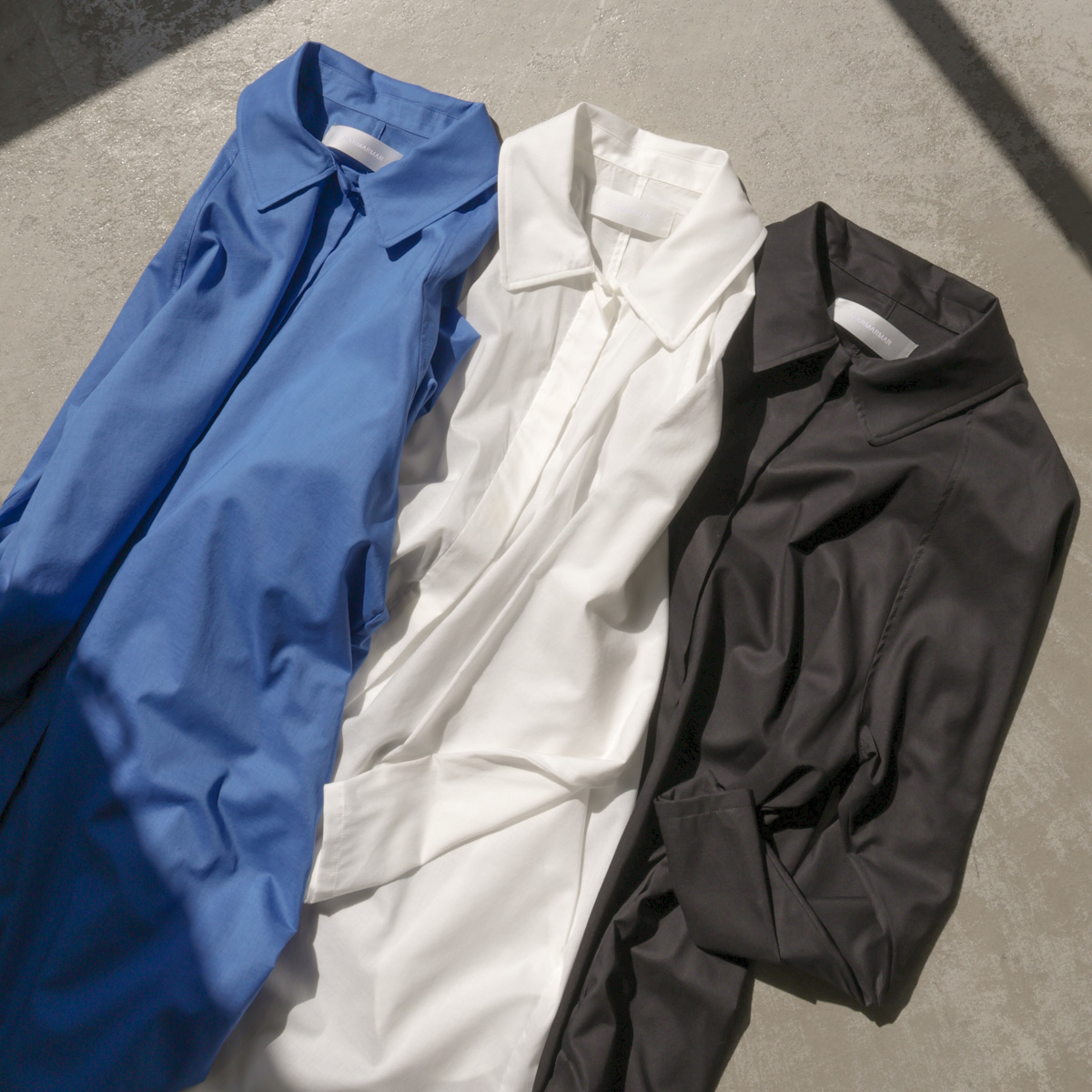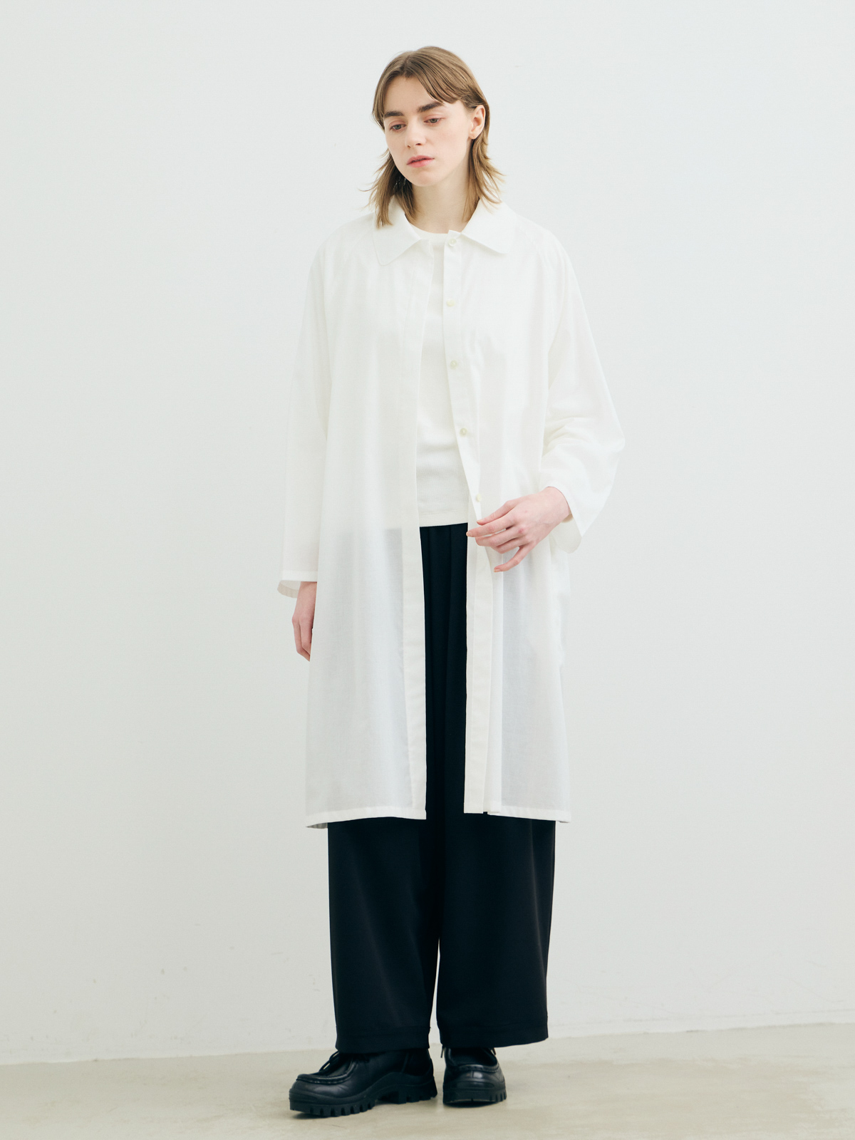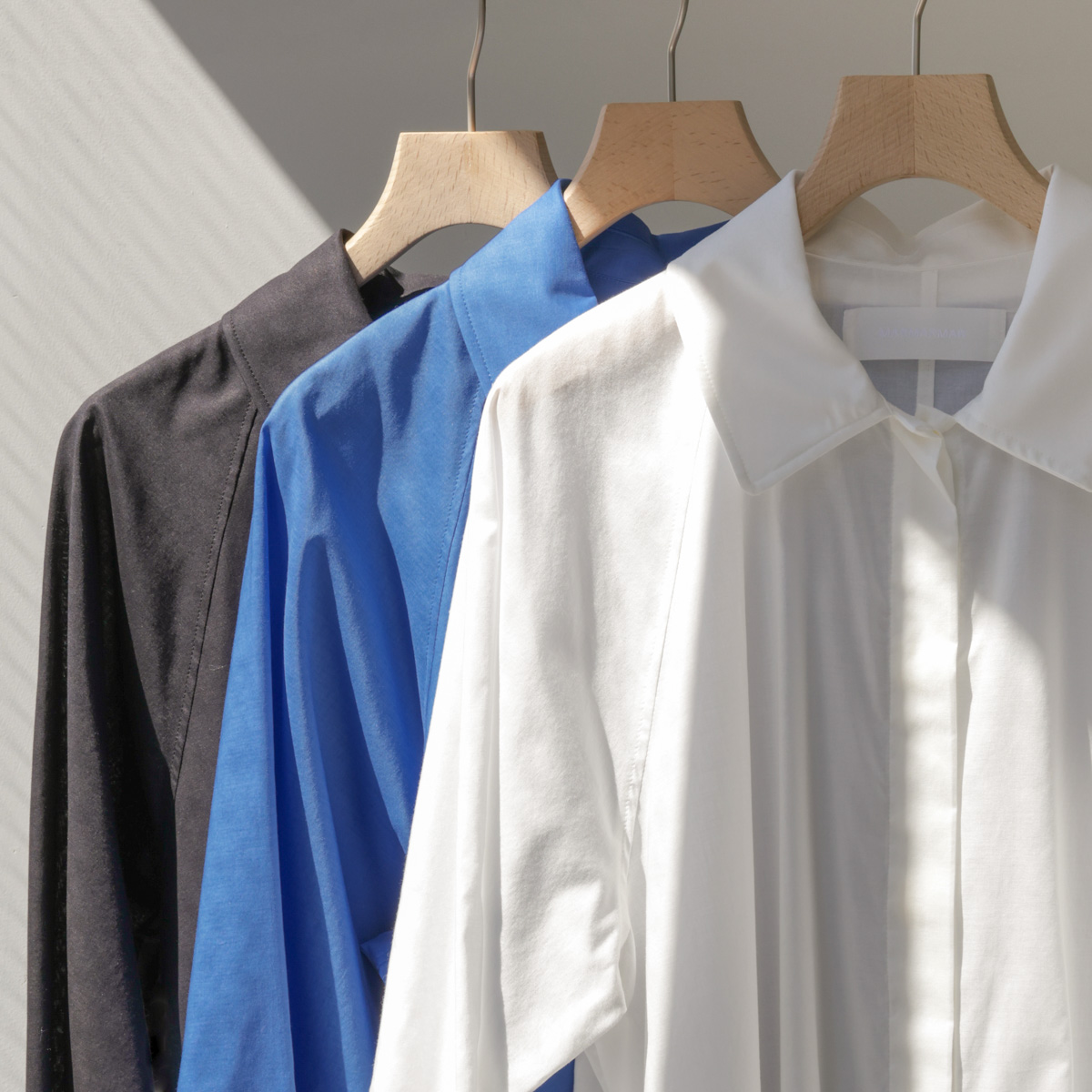 薄手の60ローン素材を使用。ほどよい反発感があり、やわらかな着心地ながらもきれいなシルエットを保ちます。ほんのり透け感のある素材で、インナーとのレイヤードも楽しめるのが魅力。軽やかな質感で、季節の変わり目の装いに取り入れたい一枚です。