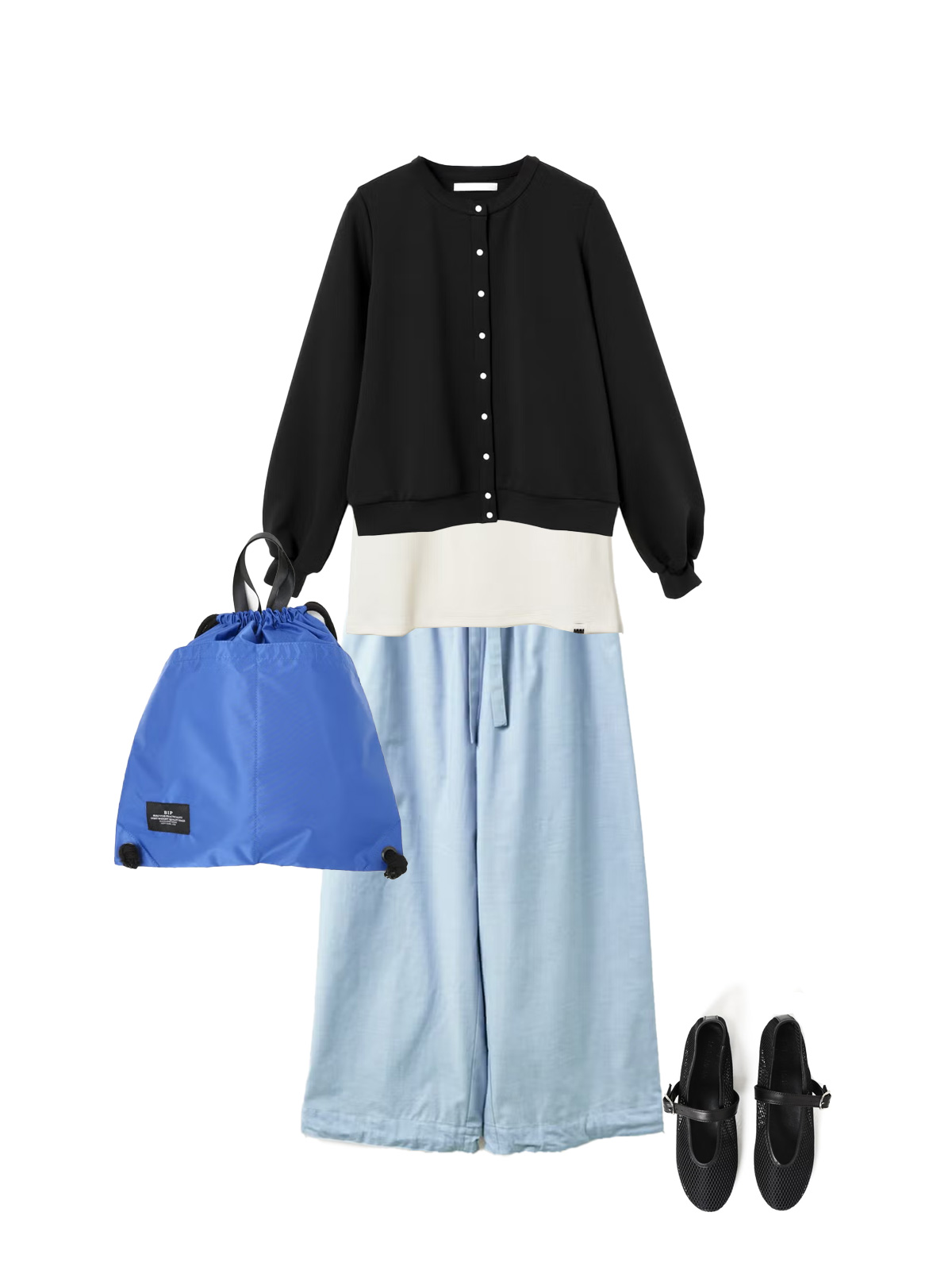 ブラックのノーカラーカーディガンにアイボリーのトップスを重ね、ライトブルーのワイドパンツを合わせた、爽やかな春のレイヤードスタイル。ブラック×アイボリー×ライトブルーの3色のグラデーションが、縦のラインを美しく見せる洗練されたシルエットに。ビビッドブルーのナップサックがスポーティなアクセントを加え、ブラックのメッシュストラップシューズでこなれた足元を演出。カジュアルな中にも大人の品格が漂う、春のおでかけにぴったりのコーディネートです。