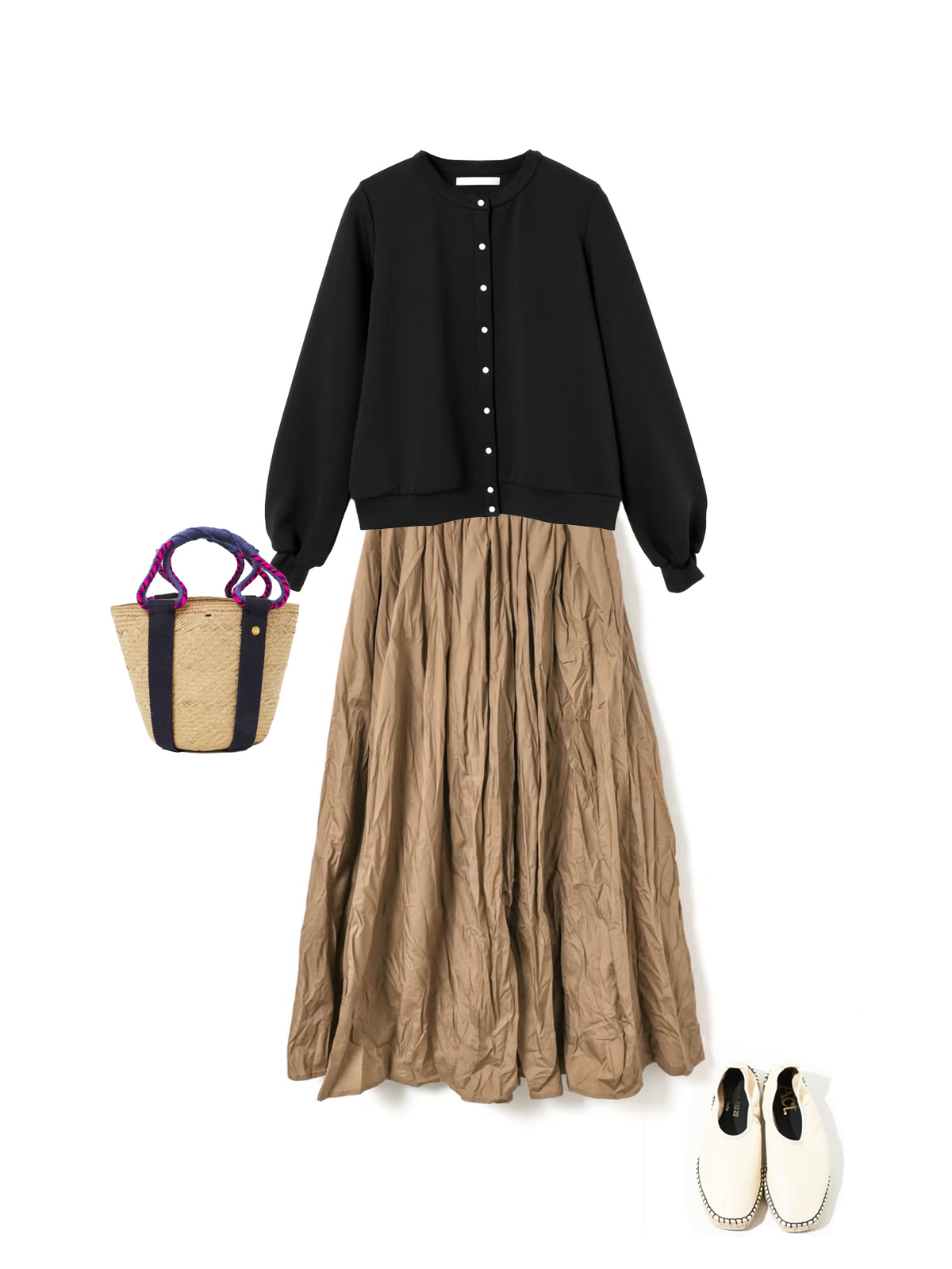 ブラックのノーカラーカーディガンに、ボリューム感のあるベージュのギャザースカートを合わせた、シックで大人の春スタイリング。異素材の組み合わせがシンプルなシルエットに奥行きをプラスし、上品な着こなしに仕上げました。かごバッグのナチュラル感がコーディネートに温もりを添え、アイボリーのシューズで軽やかな抜け感をプラス。旬のブラック×ベージュの配色で、春のおでかけをスタイリッシュに彩る大人のコーディネートです。
