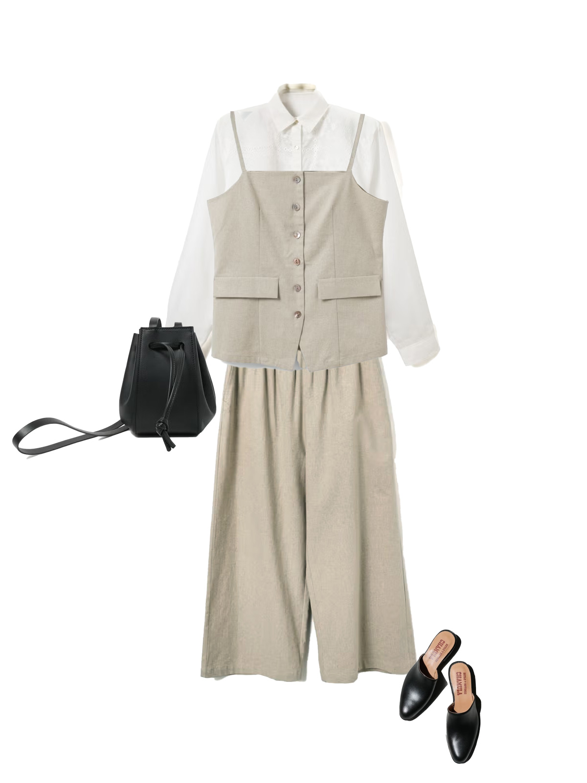 レースのシャツにリネン素材のベストとワイドパンツをセットアップ風に合わせた、ナチュラルで洗練された春のスタイリング。白とベージュのクリーンな色合わせが清潔感と上品さを演出し、異素材の重ね着が着こなしに奥行きをプラス。コンパクトバッグがシャープなアクセントとなり、同色のバックレスミュールで足元をスッキリとまとめた大人の春コーディネートです。
