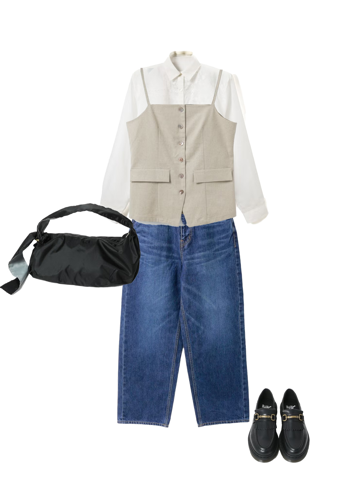 レースシャツにリネンベストを重ね、インディゴブルーのワイドデニムを合わせた、こなれ感あふれる春のカジュアルスタイル。ベージュ×ホワイト×デニムの定番カラーの組み合わせが、シンプルながらも洗練された印象を与えます。リボンディテールのブラックナイロンバッグがトレンド感をプラスし、ゴールドビットのローファーで足元に品格をプラス。デイリーからおでかけまで幅広く活躍する、大人のデニムスタイリングです。